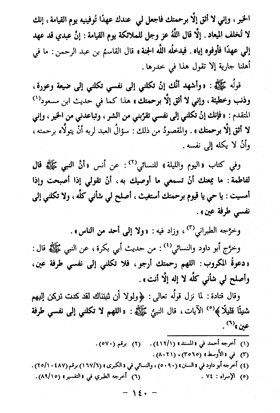 وقال قتادة: لما نزل قولُه تعالى: {وَلَوْلَا أَنْ ثَبَّتْنَاكَ لَقَدْ كِدْتَ تَرْكَنُ إِلَيْهِمْ شَيْئًا قَلِيلًا} (¬5) الآيات، قال النبيّ - صلى الله عليه وسلم -: "اللَّهُمَّ لاَ تَكِلْنِي إِلَى نَفْسِي طَرْفَةَ عَيْنٍ" (¬6).