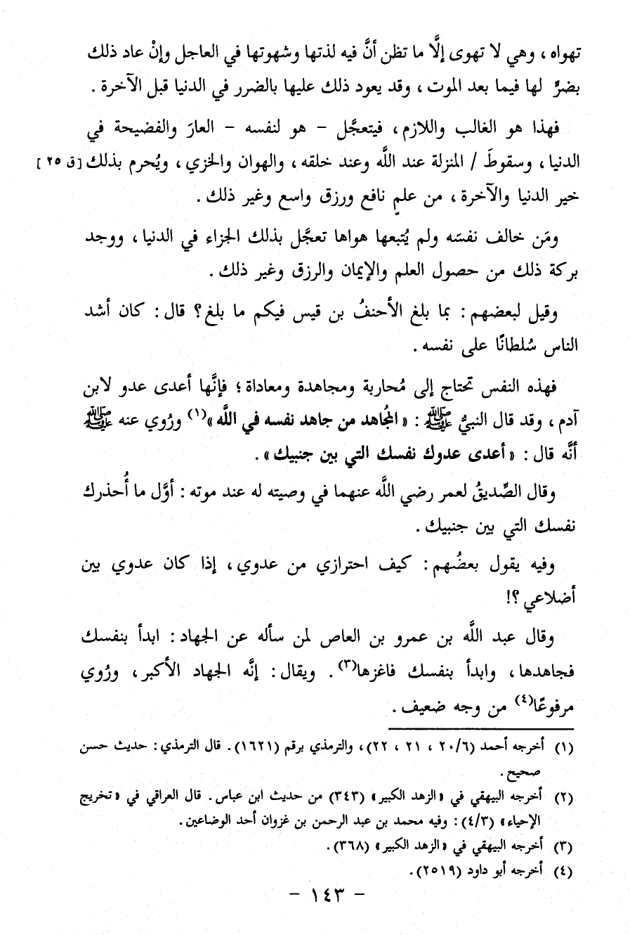 وقال عبد اللَّه بن عمرو بن العاص لمن سأله عن الجهاد: ابدأ بنفسك فجاهدها، وابدأ بنفسك فاغزها (¬3). ويقال: إنَّه الجهاد الأكبر، ورُوي مرفوعًا (¬4) من وجه ضعيف.