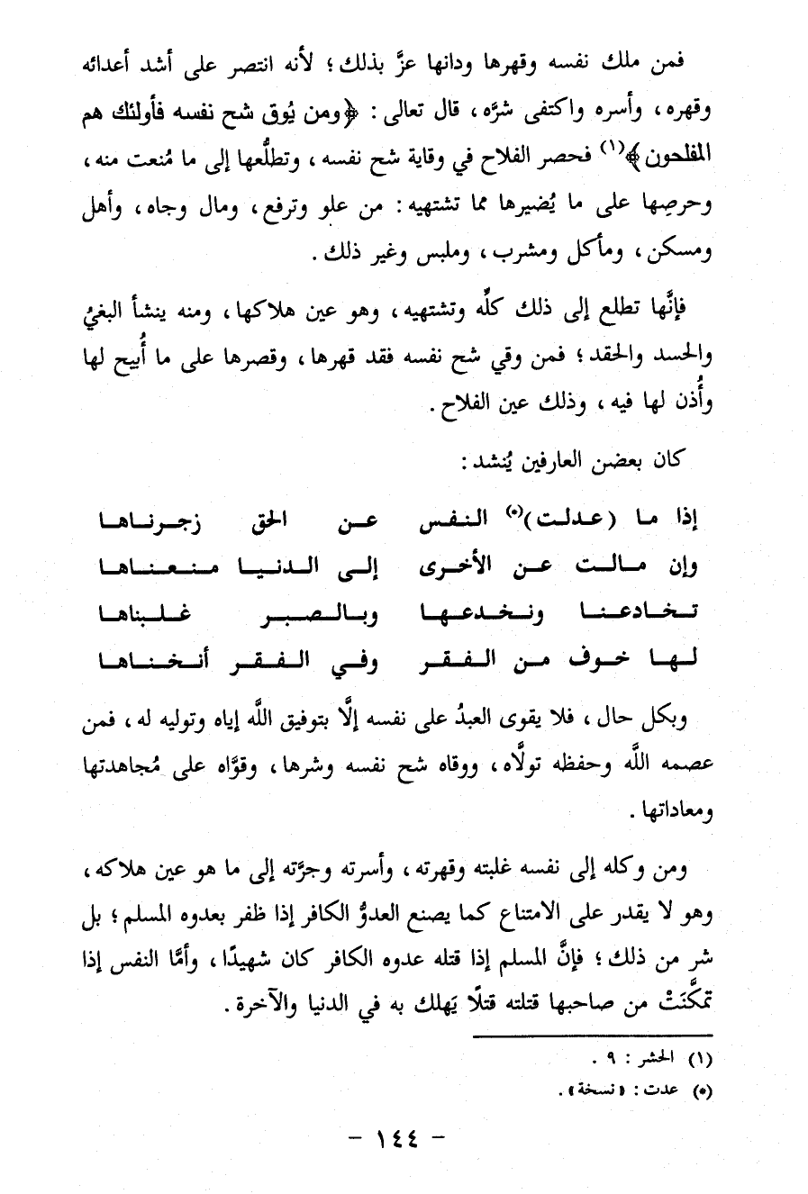 فمن ملك نفسه وقهرها ودانها عزَّ بذلك؛ لأنّه انتصر عَلَى أشد أعدائه وقهره، وأسره واكتفى شرَّه، قال تعالى: {وَمَنْ يُوقَ شُحَّ نَفْسِهِ فَأُولَئِكَ هُمُ الْمُفْلِحُونَ} (¬1) فحصر الفلاح في وقاية شح نفسه، وتطلُّعها إِلَى ما مُنعت منه، وحرصِها عَلَى ما يُضيرها مما تشتهيه: من علو وترفع، ومال وجاه، وأهل ومسكن، ومأكل ومشرب، وملبس وغير ذلك.