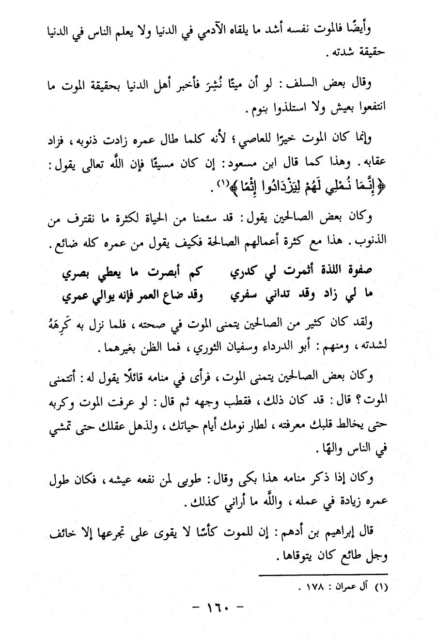 وكان بعض الصالحين يتمنى الموت، فرأى في منامه قائلًا يقول له: أتتمنى الموت؟ قال: قد كان ذلك، فقطب وجهه ثم قال: لو عرفت الموت وكربه حتى يخالط قلبك معرفته، لطار نومك أيام حياتك، ولذهل عقلك حتى تمشي في الناس والهًا.