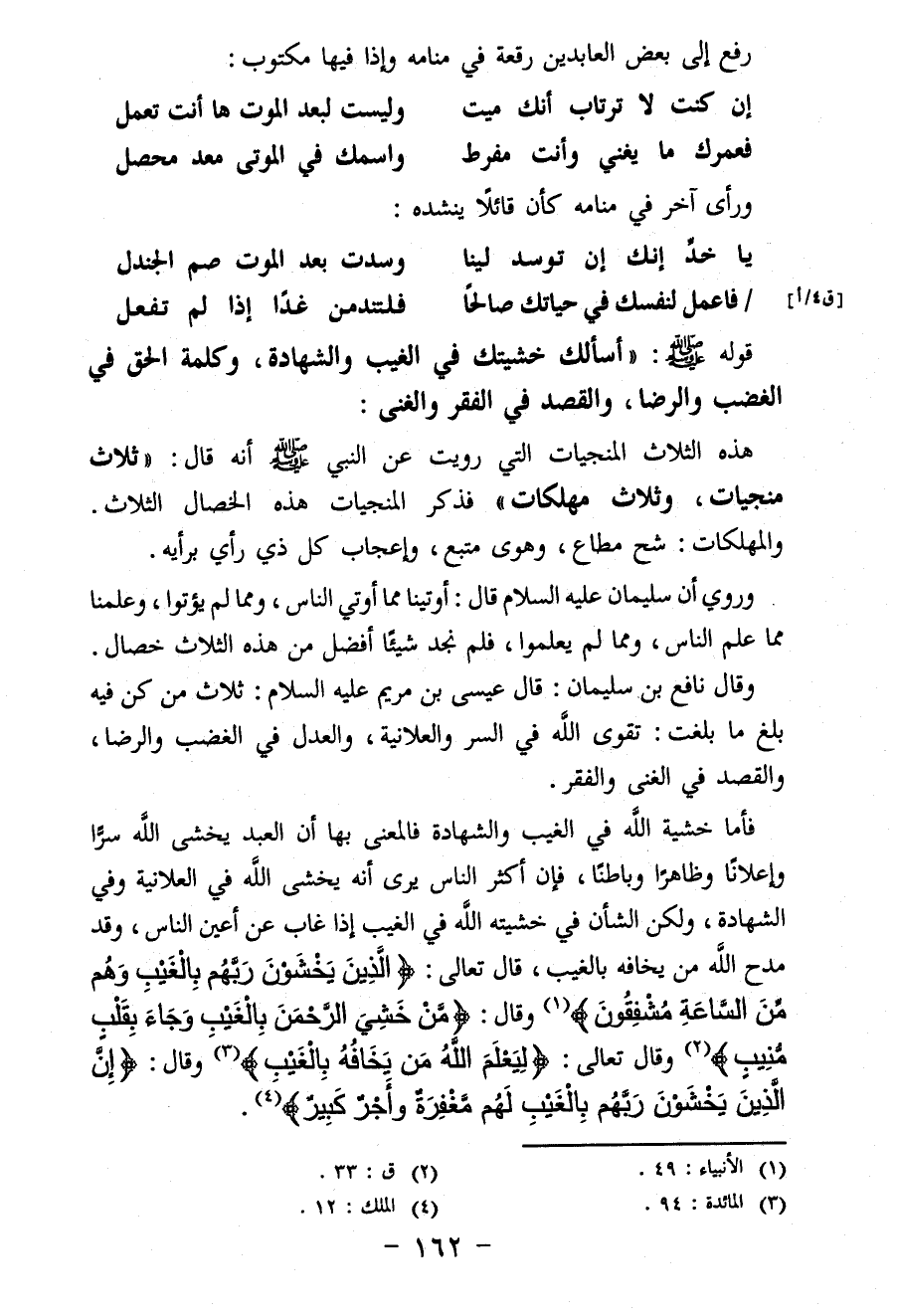 قوله - صلى الله عليه وسلم -: "أَسْأَلُكَ خَشْيَتَكَ فِي الْغَيْبِ وَالشَّهَادَةِ، وَكَلِمَةَ الْحَقِّ فِي الْغَضَبِ وَالرِّضَا، وَالْقَصْدَ فِي الْفَقْرِ وَالْغِنَى":
