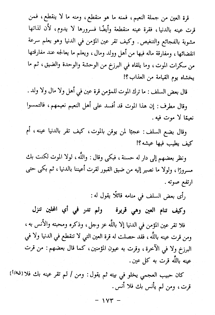 قال بعض السلف: ما ترك الموت للمؤمن قرة عين في أهل ولا مال ولا ولد. وقال مطرف: إِنَّ هذا الموت قد أفسد عَلَى أهل النعيم نعيمهم، فالتمسوا نعيمًا لا موت فيه.