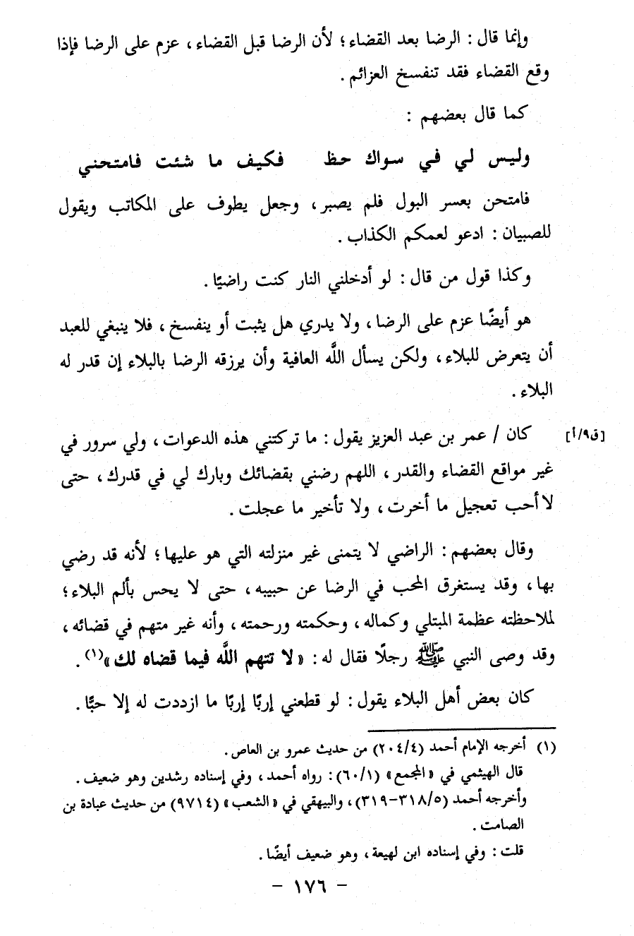 كان عمر بن عبد العزيز يقول: ما تركتني هذه الدعوات، ولي سرور في غير مواقع القضاء والقدر، اللهم رضني بقضائك وبارك لي في قدرك، حتى لا أَحَبّ تعجيل ما أخرت، ولا تأخير ما عجلت.