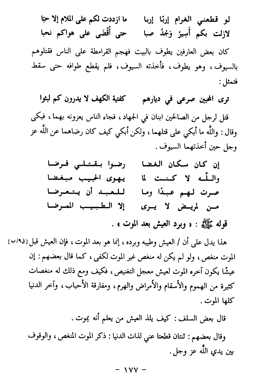 كان بعض العارفين يطوف بالبيت فهجم القرامطة عَلَى الناس فقتلوهم بالسيوف، وهو يطوف، فأخذته السيوف، فلم يقطع طوافه حتى سقط فتمثل: