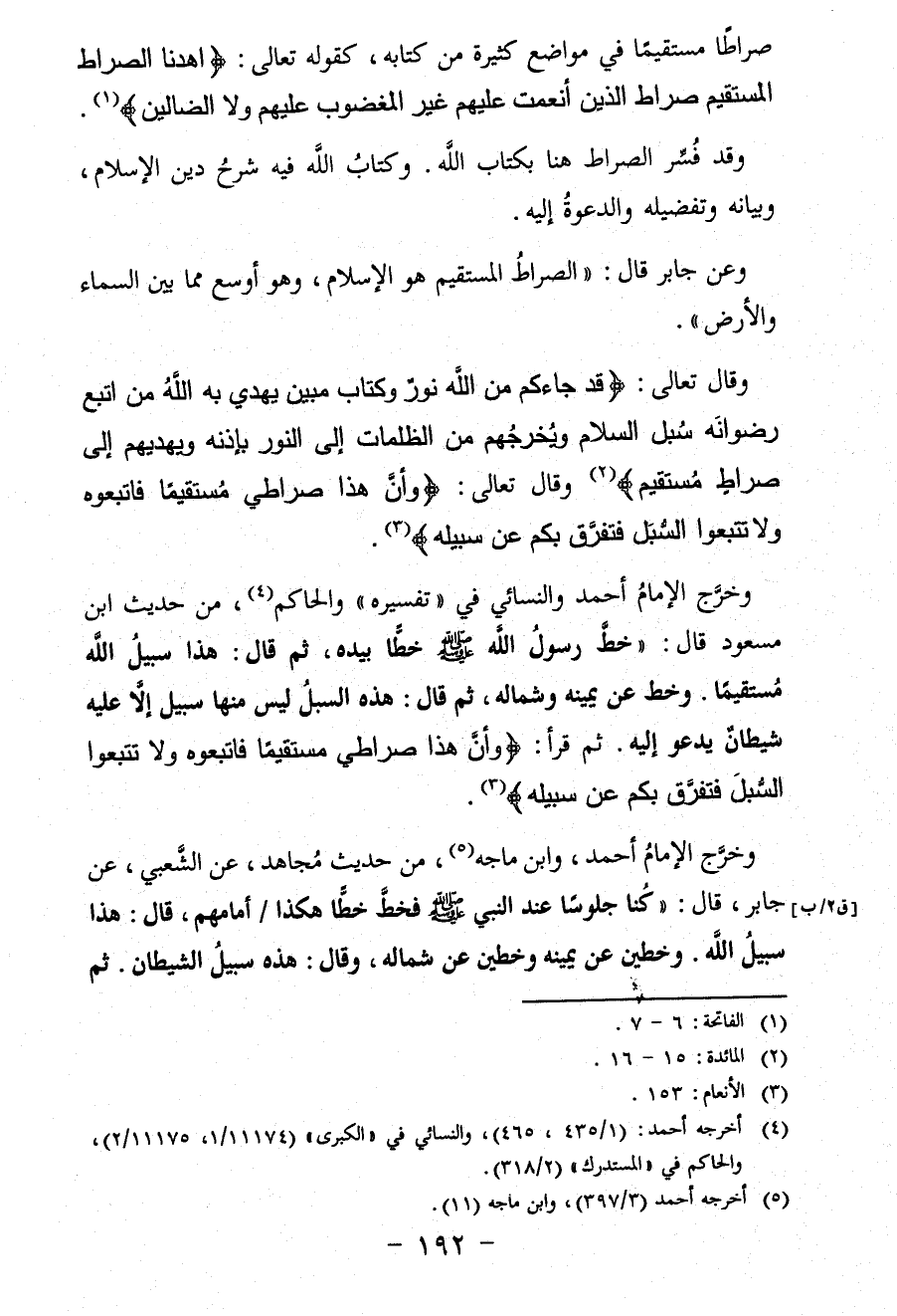 مسعود قال: "خَطَّ رَسُولُ اللَّهِ صَلَّى اللهُ عَلَيْهِ وَسَلَّمَ خَطًّا بِيَدِهِ، ثَمَّ قَالَ: "هَذَا سَبِيلُ اللهِ مُسْتَقِيمًا". وَخَطَّ عَنْ يَمِينِهِ وَشِمَالِهِ، ثُمَّ قَالَ: "هَذِهِ السُّبُلُ لَيْسَ مِنْهَا سَبِيلٌ إِلَّا عَلَيْهِ شَيْطَانٌ يَدْعُو إِلَيْهِ". ثُمَّ قَرَأَ: " {وَأَنَّ هَذَا صِرَاطِي مُسْتَقِيمًا فَاتَّبِعُوهُ وَلَا تَتَّبِعُوا السُّبُلَ فَتَفَرَّقَ بِكُمْ عَن سَبِيلِهِ} " (3).