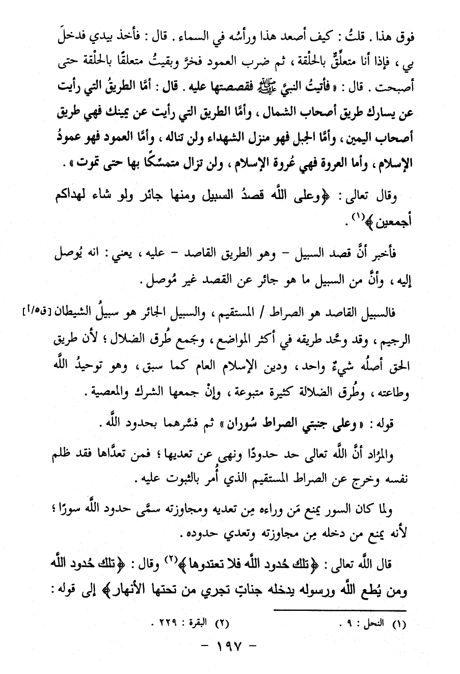 فوق هذا. قلتُ: كيف أصعد هذا ورأسُه في السماء. قال: فأخذ بيدي فدخلَ بي، فَإِذَا أنا متعلِّق بالحلْقة، ثم ضرب العمود فخرَّ وبقيتُ متعلقًا بالحلْقة حتى أصبحت. قال: فَأتَيتُ النَّبِيَّ - صلى الله عليه وسلم - فَقَصَصْتُهَا عَلَيْهِ قَالَ: «أَمَّا الطُّرُقُ الَّتِي رَأَيْتَ عَنْ يَسَارِكَ فَهِيَ طَرِيقُ أَصْحَابِ الشِّمَالِ، وَأَمَّا الطُّرُقُ الَّتِي رَأَيْتَ عَنْ يَمِينِكَ فَهِيَ طَرِيقُ أَصْحَابِ الْيَمِينِ، وَأَمَّا الْجَبَلُ فَهُوَ مَنْزِلُ الشُّهَدَاءِ وَلَنْ تَنَالَهُ، وَأَمَّا الْعَمُودُ فَهُوَ عَمُودُ الْإِسْلَامِ، وَأَمَّا الْعُرْوَةُ فَهِيَ عُرْوَةُ الْإِسْلَامِ، وَلَنْ تَزَالَ مُتَمَسِّكًا بِهَا حَتَّى تَمُوتَ».