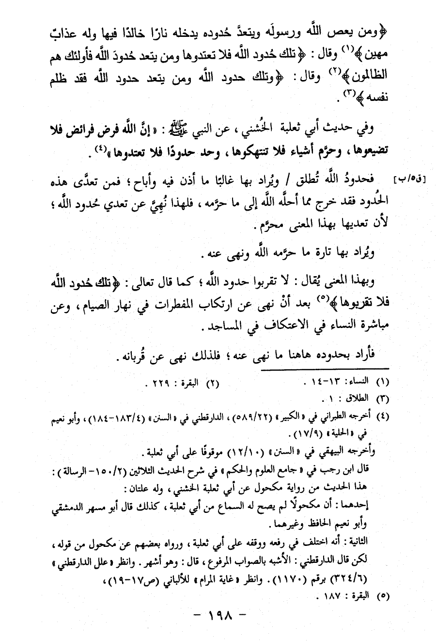 وفي حديث أبي ثعلبة الخُشني، عن النبي -صلى الله عليه وسلم-: "إِنَّ اللَّهَ فَرَضَ فَرَائِضَ فَلاً تُضَيِّعُوها، وَحَرَّمَ أَشْيَاءً فَلاَ تَنتَهِكُوهَا، وَحَّدَّ حُدُودًا فَلاً تَعْتَدُوهَا" (¬4).