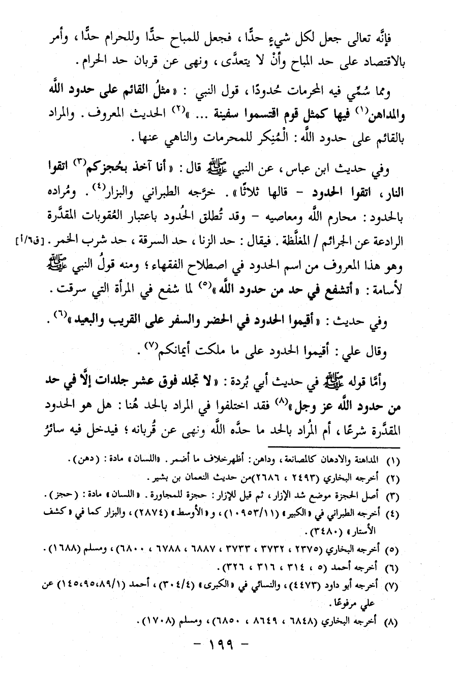 ومما سمِّي فيه المحرمات حدودًا، قول النبي: "مَثَلُ القَائِمِ عَلَى حُدُودِ اللَّهِ وَالمُدَاهِنِ (¬1) فِيهَا كَمَثَلِ قَوْمٍ اقْتَسَمُوا سَفِينَةٍ ... " (¬2) الحديث المعروف. والمراد بالقائم عَلَى حدود الله: المنكر للمحرمات والناهي عنها.