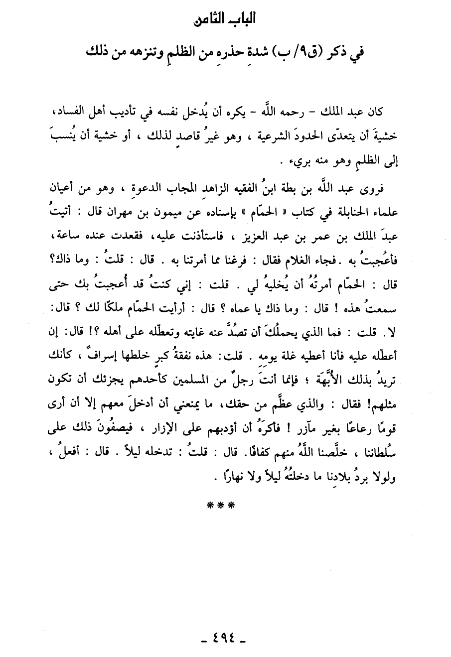 فروى عبد الله بن بطة ابنُ الفقيه الزاهدِ المجاب الدعوةِ، وهو من أعيان علماء الحنابلة في كتاب "الحمّام" بإسناده عن ميمون بن مهران قال: أتيتُ عبدَ الملك بن عمر بن عبد العزيز، فاستأذنت عليه، فقعدت عنده ساعة، فأُعجبتُ به. فجاء الغلام فَقَالَ: فرغنا مما أمرتنا به. قال: قلتُ: وما ذاك؟ قال: الحمّام أمرتُهُ أن يُخليهُ لي. قلت: إني كنتُ قد أعجبتُ بك حتى سمعتُ هذه! قال: وما ذاك يا عماه؟ قال: أرأيت الحمّام ملكًا لك؟ قال: لا. قلت: فما الَّذِي يحملُكَ أن تصُدَّ عنه غايته وتعطّله عَلَى أهله؟! قال: إِن أعطَله عليه فأنا أعطيه غلة يومِهِ. قلت: هذه نفقةُ كبرٍ خلطها إسرافٌ، كأنك تريدُ بذلك الأُبَّهَة؛ فإنما أنتَ رجلٌ من المسلمين كأحدهم يجزئك أن تكون مثلهم! فَقَالَ: والذي عظَّم من حقك، ما يمنعني أن أدخلَ معهم إلا أن أرى قومًا رعاعًا بغير مآزر! فأكرَهُ أن أؤدبهم عَلَى الإزار، فيصفُونَ ذلك عَلَى سُلطاننا، خلَّصنا اللهُ منهم كفافًا. قال: قلتُ: تدخله ليلاً. قال: افعلُ، ولولا بردُ بلادنا ما دخلتُهُ ليلاً ولا نهارًا.