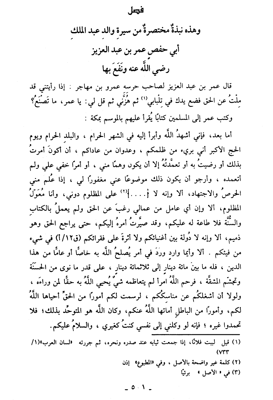 أَمَّا بَعْدُ، فَإِنِّي أُشْهِدُ اللهَ وَأَبْرَأُ إِلَيْهِ فِي الشَّهْرِ الْحَرَامِ، وَالْبَلَدِ الْحَرَامِ وَيوْمِ الْحَجِّ الْأَكْبَرِ أَنِّي بَرِيءٌ مِنْ ظَلَمَكُمْ، وَعُدْوَانِ مِنَ عَادَاكُمْ، أَنْ أَكُونَ أَمَرْتُ بِذَلِكَ أَوْ رَضِيتُ بِهِ أَوْ تَعَمَّدْتُهُ إِلَّا أَنْ يَكُونَ وَهْمًا مِنِّي، أَوْ أَمْرًا خَفِيَ عَلَيَّ لَمْ أَتَعَمَّدْهُ، وَأَرْجُو أَنْ يَكُونَ ذَلِكَ مَوْضُوعًا عَنِّي مَغْفُورًا لِي، إِذَا عَلِمَ مِنِّي الْحِرْصَ وَالِاجْتِهَادَ، ألا وَإِنَّهُ لا { .... } (¬2) عَلَى المَظْلُوم دُونِي، وَأَنَا مِعْوَلُ المَظْلُومٍ، ألا وَأَيُّ عَامِلٍ مِنْ عُمَّالِي رَغِبَ عَنِ الْحَقِّ وَلَمْ يَعْمَلْ بِالْكِتَابِ وَالسُّنَّةِ فَلا طَاعَةَ لَهُ عَلَيْكُمْ، وَقَدْ صَيَّرْتُ أَمَرَهُ إِلَيْكُمْ، حَتَّى يُرَاجِعَ الْحَقَّ وَهُوَ ذَمِيمٌ، ألا وَإِنَّهُ لا دَوْلَةَ بَيْنَ أَغْنِيَائِكُمْ وَلا أَثَرَةَ عَلَى فُقَرَائِكُمْ فِي شَيْءٍ مِنْ فَيْئِكُمْ. ألا وَأَيُّمَا وَارِدٍ وَرَدَ فِي أَمْرٍ يُصْلِحُ اللهُ بِهِ خَاصًّا أَوْ عَامًّا مِنْ هَذَا الدِّينِ، فَلَهُ مَا بَيْنَ مِائَةِ دِينَارٍ إِلَى ثَلَاثِمِائَةِ دِينَارٍ، عَلَى قَدْرِ مَا نَوَى مِنَ الْحَسَنَةِ وَتَجَشَّمَ الْمَشَقَّةِ، فَرَحِمَ اللهُ امْرَأً لَمْ يَتَعَاظَمْهُ سَفَرٌ يُحْيِي اللهُ بِهِ حَقًّا لِمَنْ وَرَاءَهُ، وَلَوْلا أَنْ أَشْغَلَكُمْ عَنْ مَنَاسِكِكُمْ، لَرَسَمْتُ لَكُمْ أُمُورًا مِنَ الْحَقِّ أَحْيَاهَا اللهُ لَكُمْ، وَأُمُورًا مِنَ الْبَاطِلِ أَمَاتَهَا اللهُ عَنْكُمْ، وَكَانَ اللهُ هُوَ الْمُتَوَحِّدُ بِذَلِكَ؛ فَلَا تَحْمَدُوا غَيْرَهُ، فَإِنَّهُ لَوْ وَكَّلَنِي إِلَى نَفْسِي كُنْتُ كَغَيْرِي، وَالسَّلَامُ عَلَيْكُمْ.