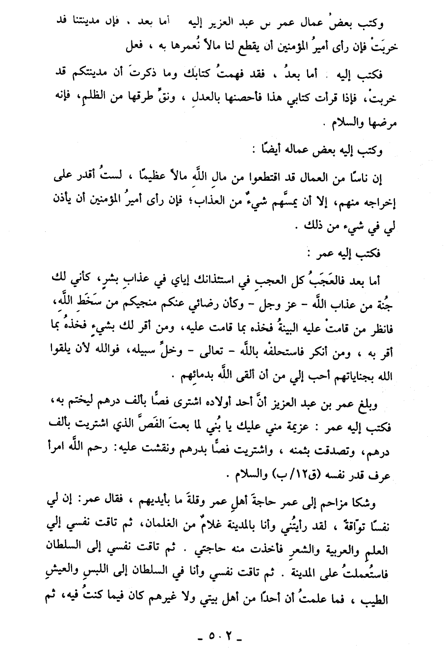 وكتب بعضُ عمال عمر بن عبد العزير إِلَيْهِ أما بعد، فإن مدينتنا قد خربَتْ فإن رأى أميرُ المؤمنين أن يقطع لنا مالاً نُعمرها به، فعل فكتب إِلَيْهِ. أما بعدُ، فقد فهمتُ كتابك وما ذكرتَ أن مدينتكم قد خربتْ، فَإِذَا قرأت كتابي هذا فأحصنها بالعدلِ، ونقِّ طرقها من الظلمِ، فإنه مرضها والسلام.