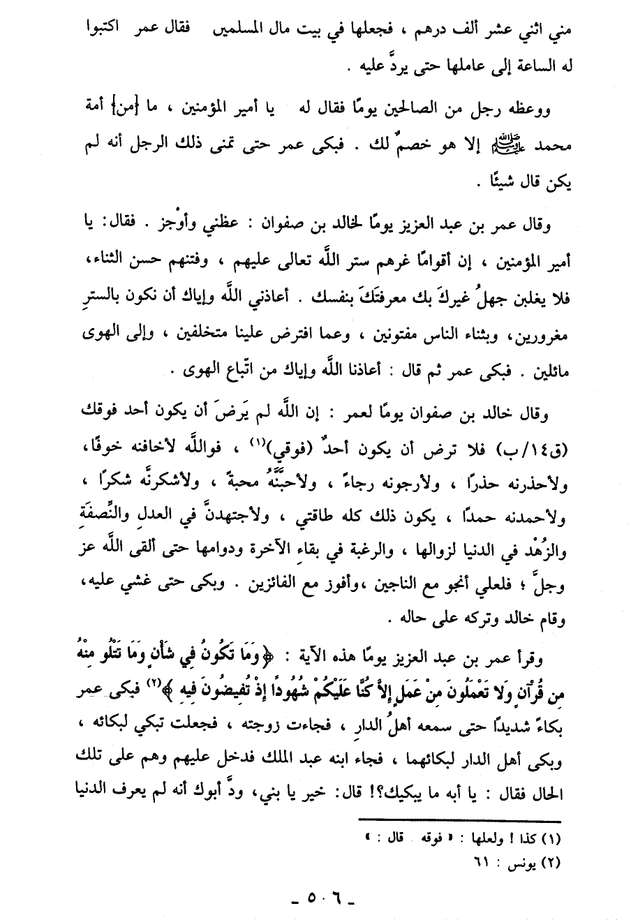 وقرأ عمر بن عبد العزيز يومًا هذه الآية: {وَمَا تَكُونُ فِي شَأْنٍ وَمَا تَتْلُو مِنْهُ مِنْ قُرْآنٍ وَلا تَعْمَلُونَ مِنْ عَمَلٍ إِلَّا كُنَّا عَلَيْكُمْ شُهُودًا إِذْ تُفِيضُونَ فِيهِ} (¬2) فبكى عمر بكاءً شديدًا حتى سمعه أهلُ الدارِ، فجاءت زوجته، فجعلت تبكي لبكائه، وبكى أهل الدار لبكائهما، فجاء ابنه عبد الملك فدخل عليهم وهم عَلَى تلك الحال فَقَالَ: يا أبه ما يبكيك؟! قال: خير يا بني، ودَّ أبوك أنه لم يعرف الدُّنْيَا