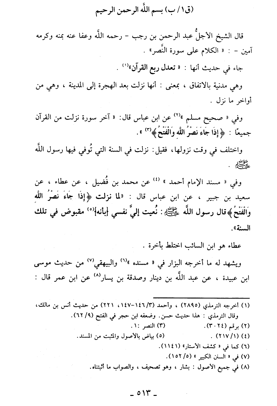 قال الشيخ الأجلُّ عبد الرحمن بن رجب -رحمه الله وعفا عنه بمنه وكرمه آمين-: "الكلام عَلَى سورة النَّصر".