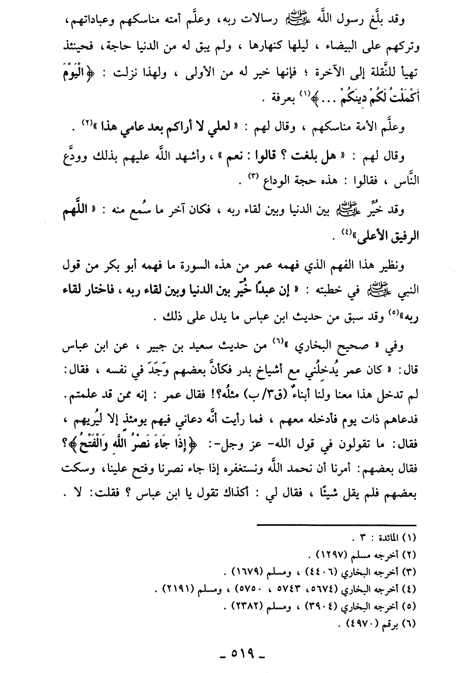 وفي "صحيح البخاري" (¬6) من حديث سعيد بن جبير، عن ابن عباس قال: كَانَ عُمَرُ يُدْخِلُنِي مَعَ أَشْيَاخِ بَدْرٍ فَكَأَنَّ بَعْضَهُمْ وَجَدَ فِي نَفْسِهِ، فَقَالَ: لِمَ تُدْخِلُ هَذَا مَعَنَا وَلَنَا أَبْنَاءٌ مِثْلُهُ؟! فَقَالَ عُمَرُ: إِنَّهُ مِمَّنْ قَدْ عَلِمْتُمْ. فَدَعَاهُمْ ذَاتَ يَوْمٍ فَأَدْخَلَهُ مَعَهُمْ، فَمَا رأيتُ أَنَّهُ دَعَانِي فِيهِمْ يَوْمَئِذٍ إِلَّا لِيُرِيَهُمْ، فَقَالَ: مَا تَقُولُونَ فِي قَوْلِ اللَّهِ -عَزَّ وَجَلَّ-: {إِذَا جَاءَ نَصْرُ اللَّهِ وَالفَتْحُ}؟ فَقَالَ بَعْضُهُمْ: أُمِرْنَا أَنْ نَحْمَدَ اللَّهَ وَنَسْتَغْفِرَهُ إِذَا جَاءَ نُصِرْنَا وَفُتِحَ عَلَيْنَا، وَسَكَتَ بَعْضُهُمْ فَلَمْ يَقُلْ شَيْئًا، فَقَالَ لِي: أَكَذَاكَ تَقُولُ يَا ابْنَ عَبَّاسٍ؟ فَقُلْتُ: لاَ.