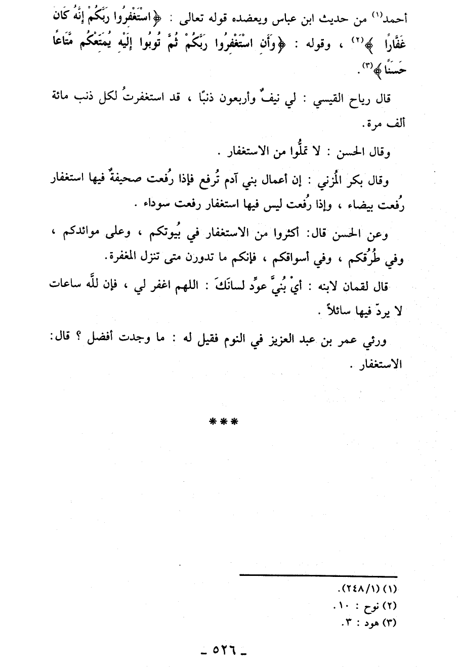 وقال بكر المُزني: إِنَّ أعمال بني آدم ترفع فَإِذَا رُفعت صحيفةٌ فيها استغفار رُفعت بيضاء، وإذا رُفعت ليس فيها استغفار رفعت سوداء.