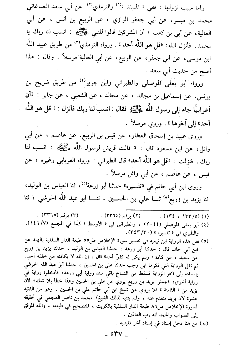 (¬5) نقل هذه الرواية ابن تيمية في تفسير سورة الإخلاص ص55 طبعة الدار السلفية بالهند عن ابن أبي حاتم قال: حدثنا أبو زرعة، حدثنا العباس بن الوليد، حدثنا يزيد بن زريع عن سعيد، عن قتادة "ولم يكن له كفوًا أحد" قال: إِنَّ الله لا يكافئه من خلقه أحد.