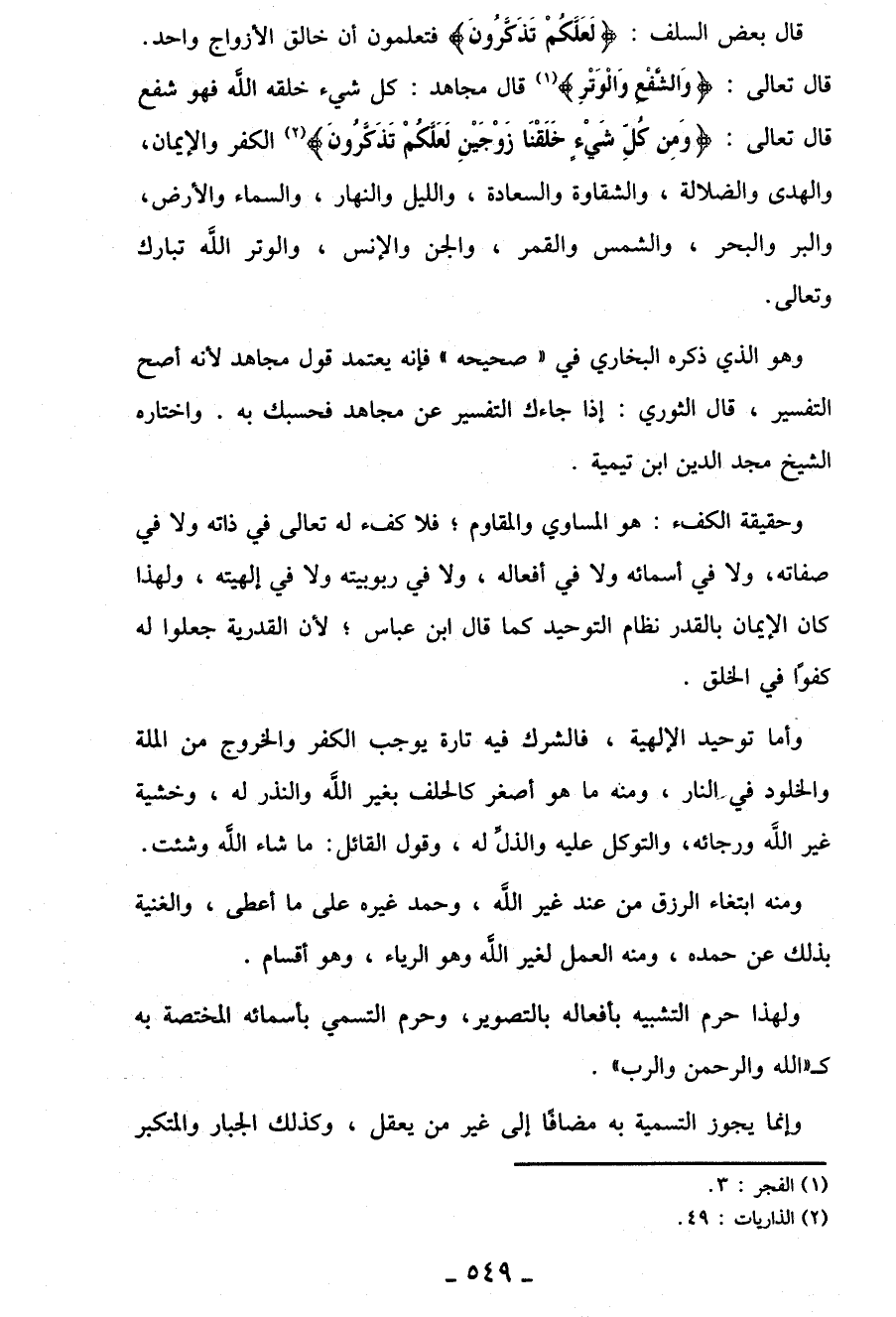 قال تعالى: {وَالشَّفْعِ وَالْوَتْرِ} (¬1) قال مجاهد: كل شيء خلقه الله فهو شفع قال تعالى: {وَمِنْ كُلِّ شَيْءٍ خَلَقْنَا زَوْجَيْنِ لَعَلَّكُمْ تَذَكَّرُونَ} (¬2) الكفر والإيمان، والهدى والضلالة، والشقاوة والسعادة، والليل والنهار، والسماء والأرض، والبر والبحر، والشمس والقمر، والجن والإنس، والوتر الله تبارك وتعالى.