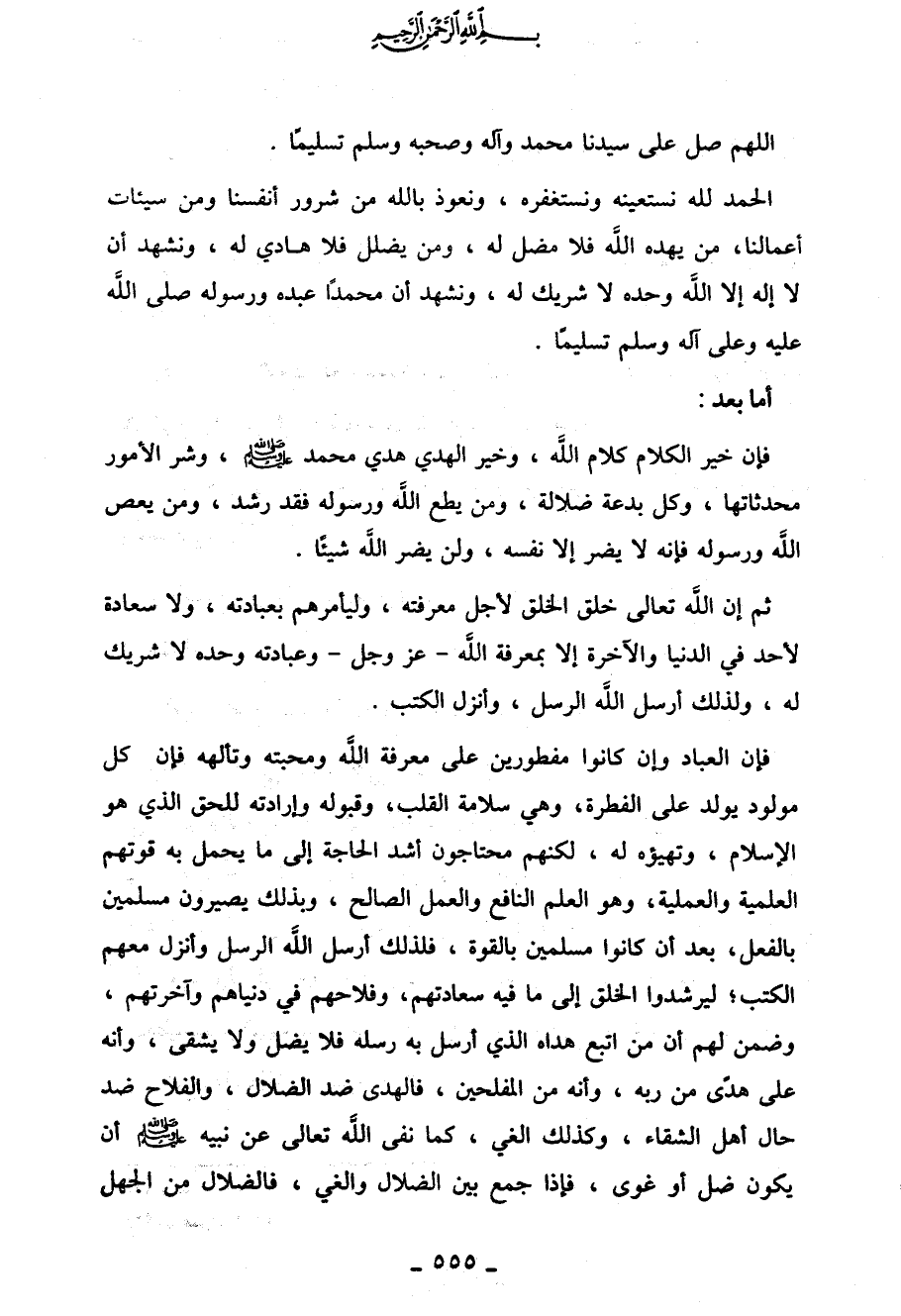فإن خير الكلام كلام الله، وخير الهدي هدي محمد - صلى الله عليه وسلم -، وشر الأمور محدثاتها، وكل بدعة ضلالة، ومن يطع الله ورسوله فقد رشد، ومن يعص الله ورسوله فإنه لا يضر إلا نفسه، ولن يضر الله شيئًا.