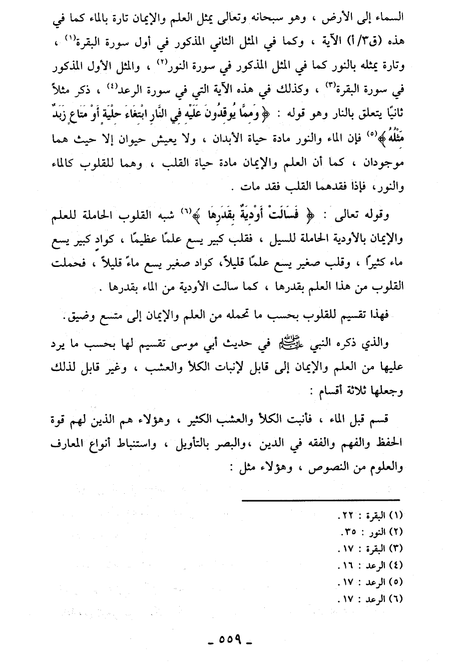 وقوله تعالى: {فَسَالَتْ أَوْدِيَةٌ بِقَدَرِهَا} (¬6) شبه القلوب الحاملة للعلم والإيمان بالأودية الحاملة للسيل، فقلب كبير يسع علمًا عظيمًا، كوادٍ كبير يسع ماء كثيرًا، وقلب صغير يسع علمًا قليلاً، كواد صغير يسع ماءً قليلاً، فحملت القلوب من هذا العِلْم بقدرها، كما سألت الأودية من الماء بقدرها.