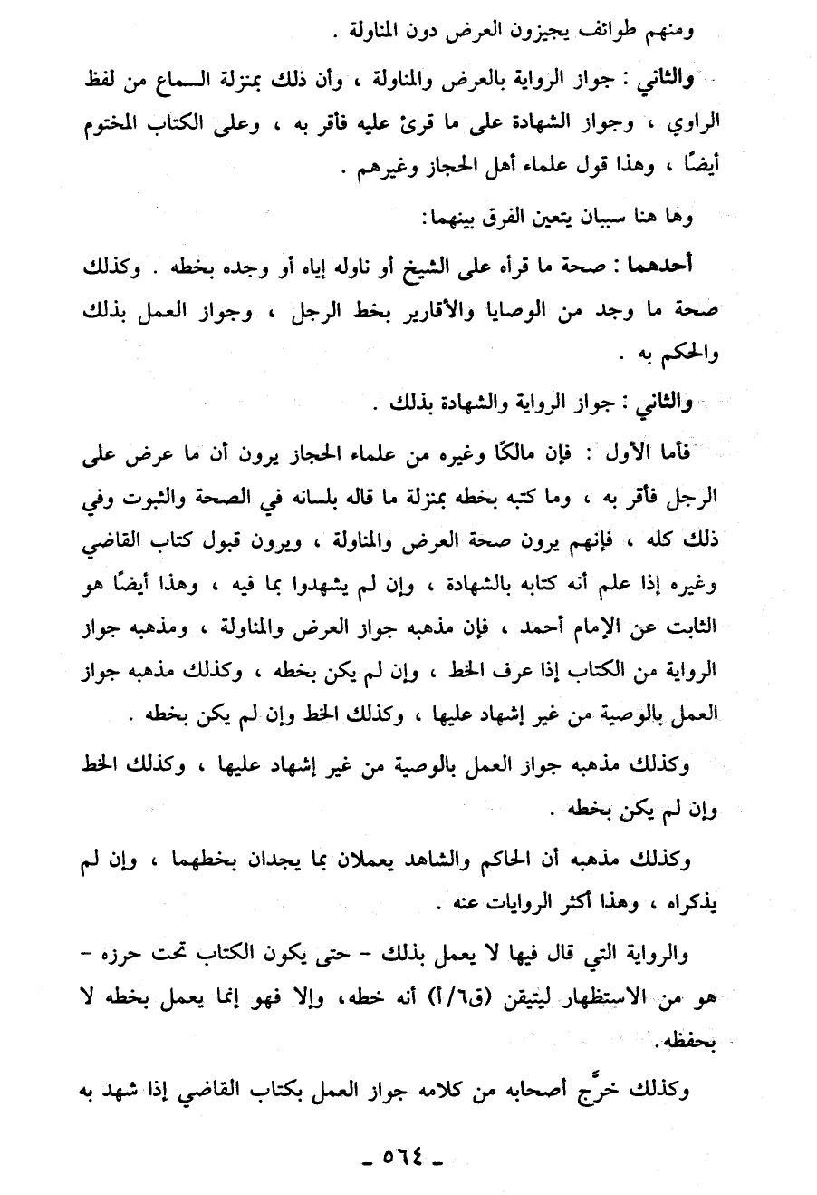 فأما الأول: فإن مالكًا وغيره من علماء الحجاز يرون أن ما عرض عَلَى الرجل فأقر به، وما كتبه بخطه بمنزلة ما قاله بلسانه في الصحة والثبوت وفي ذلك كله، فإنهم يرون صحة العرض والمناولة، ويرون قبول كتاب القاضي وغيره إذا علم أنه كتابه بالشهادة، وإن لم يشهدوا بما فيه، وهذا أيضاً هو الثابت عن الإمام أحمد، فإن مذهبه جواز العرض والمناولة، ومذهبه جواز الرواية من الكتاب إذا عرف الخط، وإن لم يكن بخطه، وكذلك مذهبه جواز العمل بالوصية من غير إشهاد عليها، وكذلك الخط وإن لم يكن بخطه.