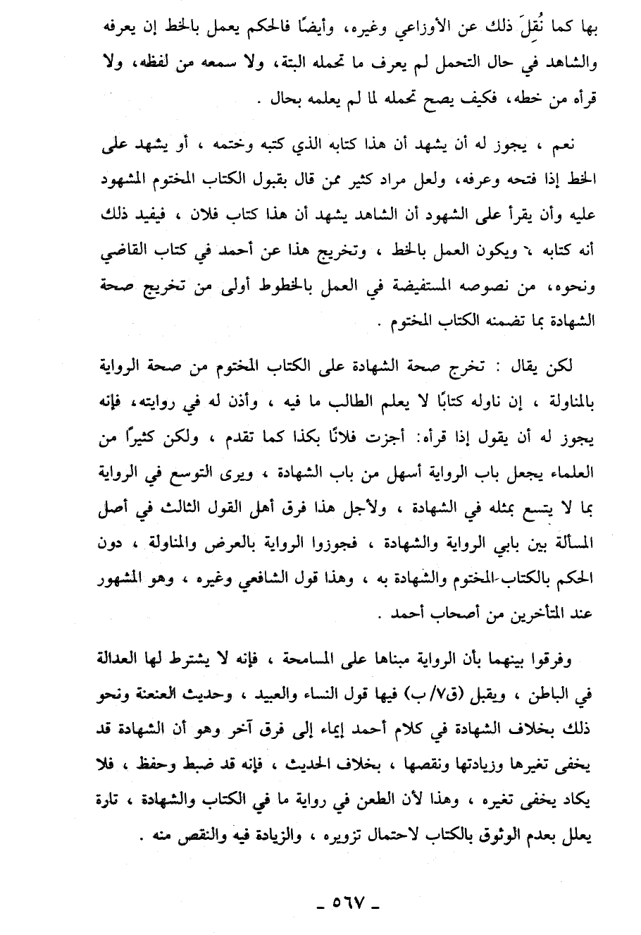 لكن يقال: تخرج صحة الشهادة عَلَى الكتاب المختوم من صحة الرواية بالمناولة، إِن ناوله كتابًا لا يعلم الطالب ما فيه، وأذن له في روايته، فإنه يجوز له أن يقول إذا قرأه: أجزت فلانًا بكذا كما تقدم، ولكن كثيرًا من العُلَمَاء يجعل باب الرواية أسهل من باب الشهادة، ويرى التوسع في الرواية بما لا يتسع بمثله في الشهادة، ولأجل هذا فرق أهل القول الثالث في أصل المسألة بين بابي الرواية والشهادة، فجوزوا الرواية بالعرض والمناولة، دون الحكم بالكتاب المختوم والشهادة به، وهذا قول الشافعي وغيره، وهو المشهور عند المتأخرين من أصحاب أحمد.