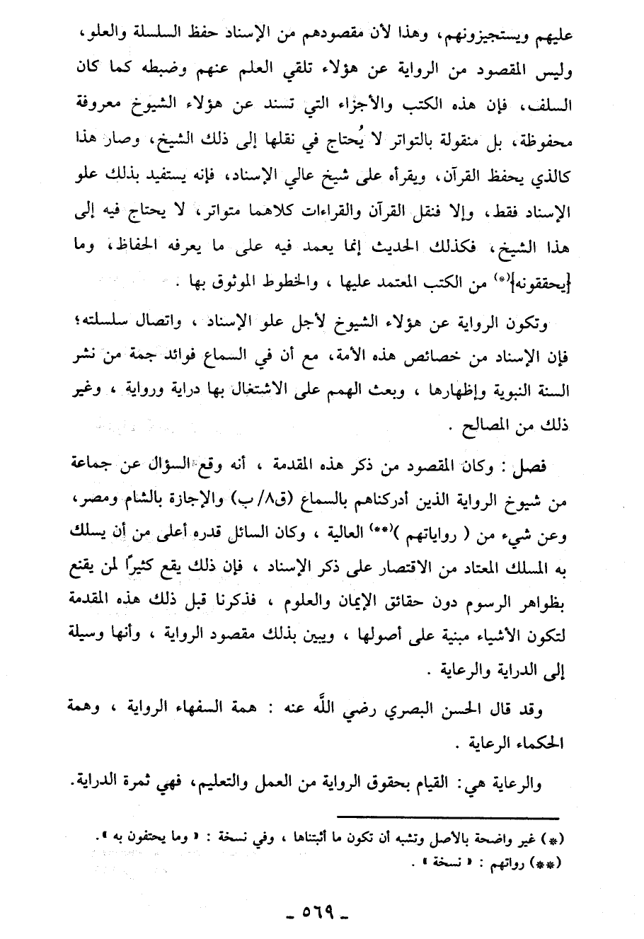 فصل: وكان المقصود من ذكر هذه المقدمة، أنه وقع السؤال عن جماعة من شيوخ الرواية الذين أدركناهم بالسماع والإجازة بالشام ومصر، وعن شيء من (رواياتهم) (**) العالية، وكان السائل قدره أعلى من أن يسلك به المسلك المعتاد من الاقتصار عَلَى ذكر الإسناد، فإن ذلك يقع كثيرًا لمن يقنع بظواهر الرسوم دون حقائق الإيمان والعلوم، فذكرنا قبل ذلك هذه المقدمة لتكون الأشياء مبنية عَلَى أصولها، ويبين بذلك مقصود الرواية، وأنها وسيلة إِلَى الدراية والرعاية.
