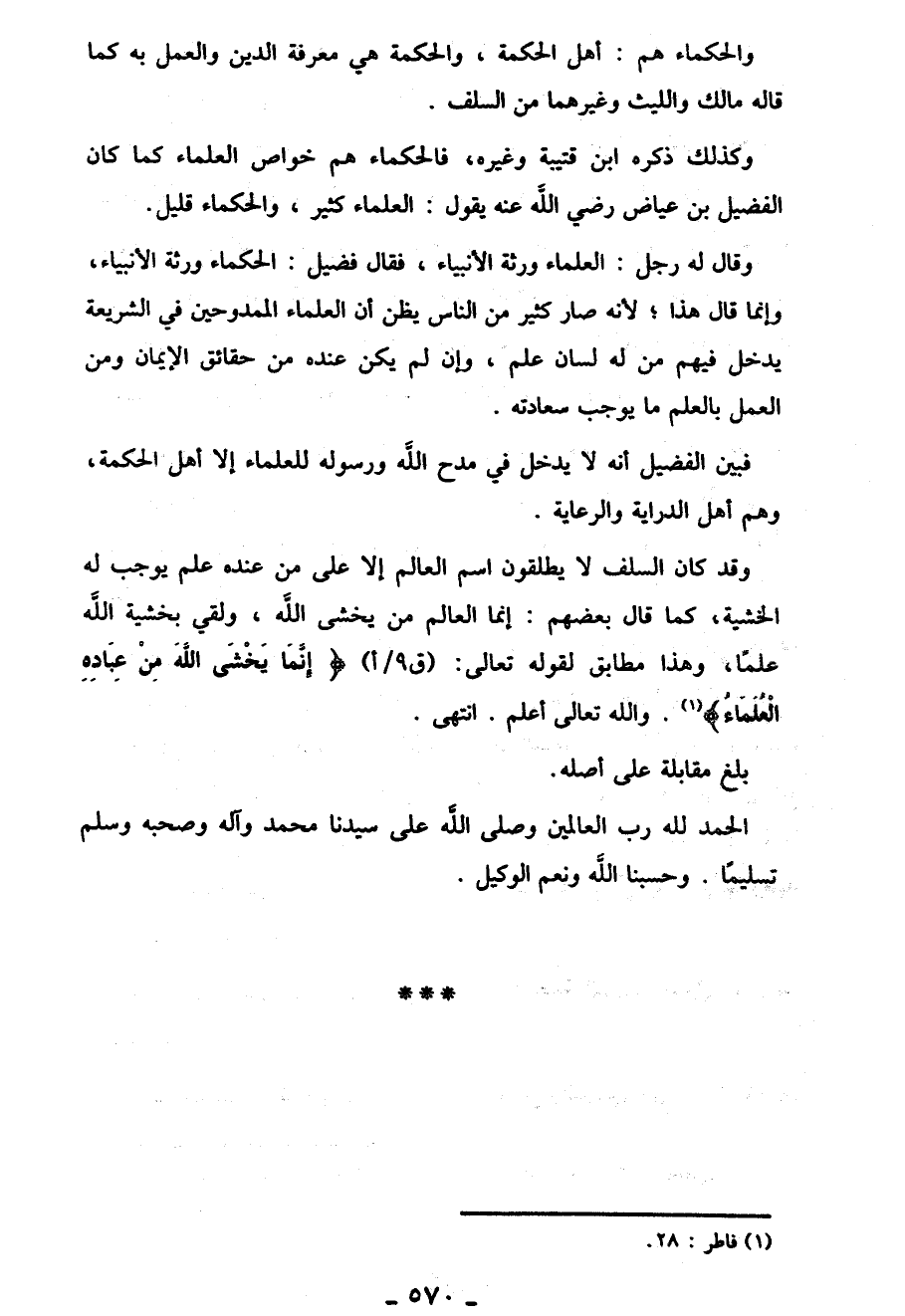 وقد كان السَّلف لا يطلقون اسم العالم إلا عَلَى من عنده علم يوجب له الخشية، كما قال بعضهم: إِنَّمَا العالم من يخشى الله، ولقي بخشية الله علمًا، وهذا مطابق لقوله تعالى: {إِنَّمَا يَخْشَى اللَّهَ مِنْ عِبَادِهِ الْعُلَمَاءُ} (¬1). والله تعالى أعلم. انتهى. بلغ مقابلة عَلَى أصله.