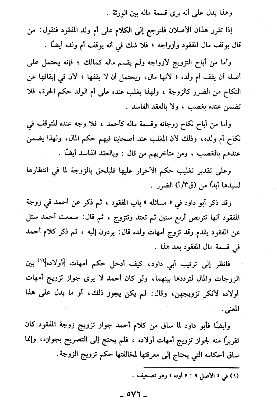 وأيضًا فأبو داود لما ساق من كلام أحمد جواز تزويج زوجة المفقود كان تقريرًا منه لجواز تزويج أمهات أولاده، فلم يحتج إِلَى التصريح بجوازه، وإنما ساق أحكامه التي يحتاج إِلَى معرفتها لمخالفتها حكم تزويج الزوجة.