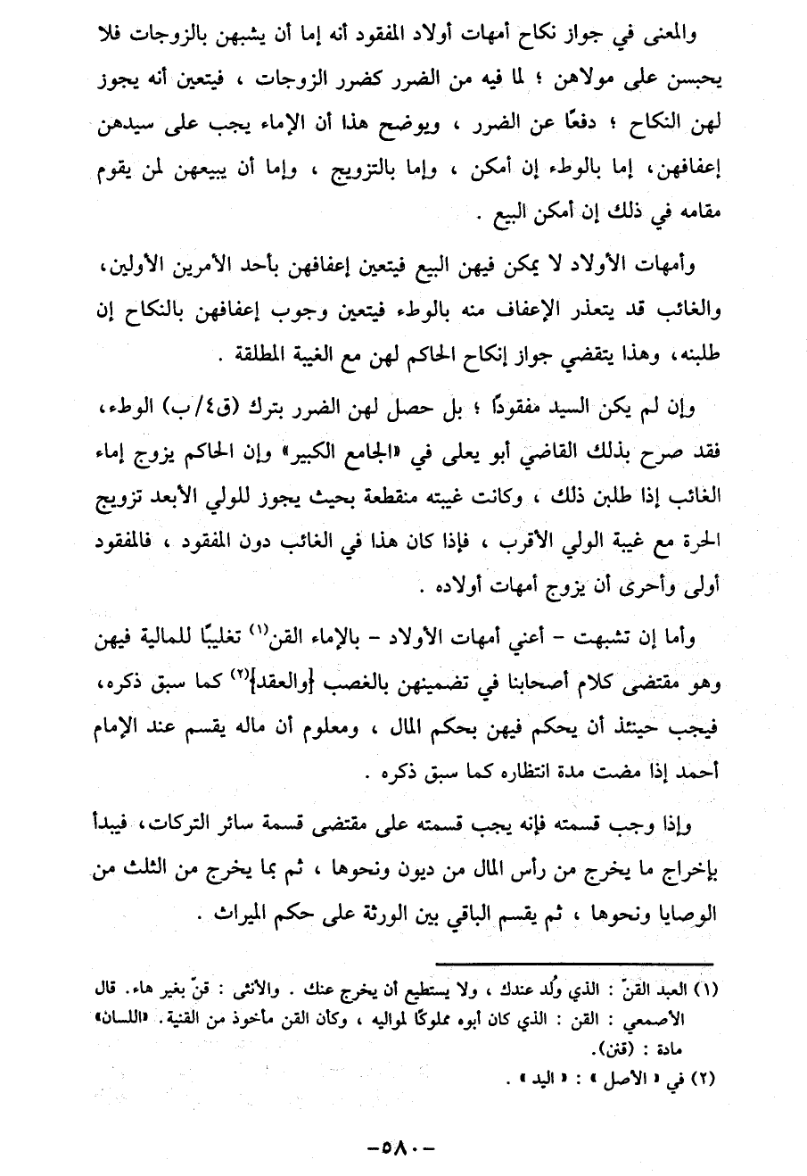 وأما إِن تشبهت -أعني أمهات الأولاد- بالإماء القن (¬1) تغليبًا للمالية فيهن وهو مقتضى كلام أصحابنا في تضمينهن بالغصب {والعقد} (¬2) كما سبق ذكره، فيجب حينئذ أن يحكم فيهن بحكم المال، ومعلوم أن ماله يقسم عند الإمام أحمد إذا مضت مدة انتظاره كما سبق ذكره.