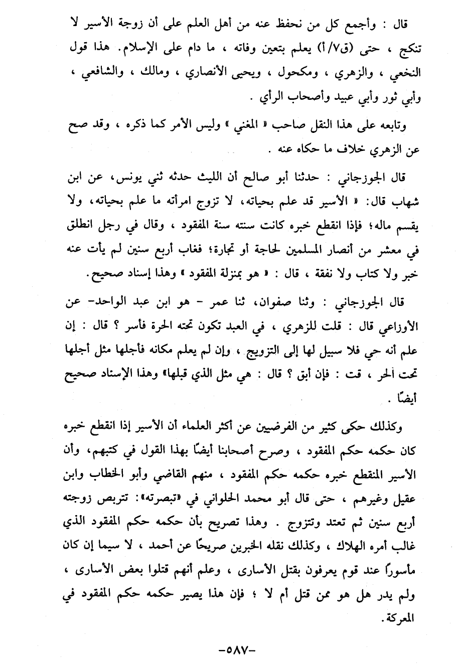 قال: وأجمع كل من نحفظ عنه من أهل العِلْم عَلَى أن زوجة الأسير لا تنكج، حتى يعلم بتعين وفاته، ما دام عَلَى الإسلام. هذا قول النخعي، والزهري، ومكحول، ويحيى الأنصاري، ومالك، والشافعي، وأبي ثور وأبي عبيد وأصحاب الرأي.