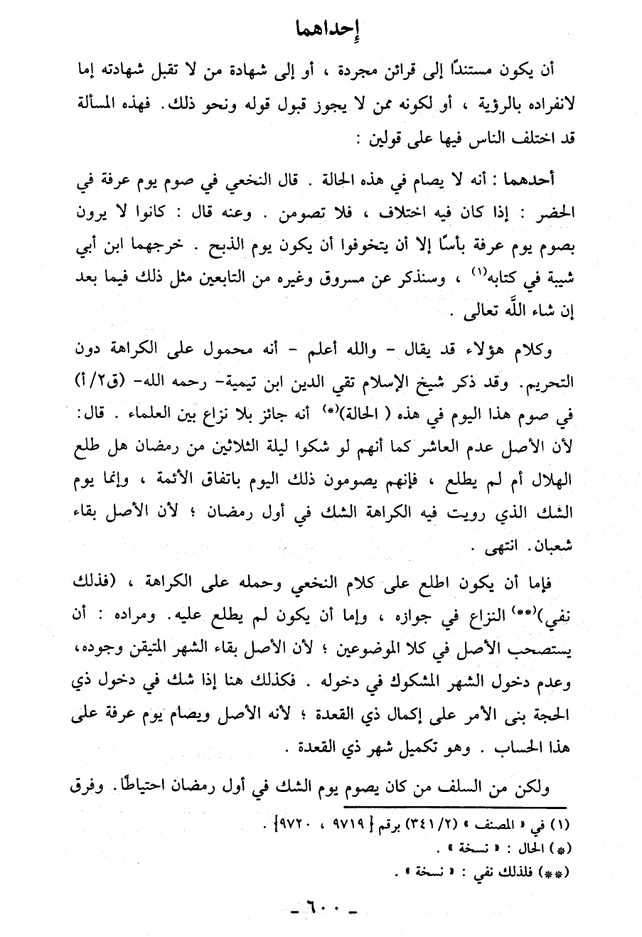 فإما أن يكون اطلع عَلَى كلام النخعي وحمله عَلَى الكراهة، (فذلك نفي) (**) النزاع في جوازه، وإما أن يكون لم يطلع عليه. ومراده: أن يستصحب الأصل في كلا الموضوعين؛ لأنّ الأصل بقاء الشهر المتيقن وجوده، وعدم دخول الشهر المشكوك في دخوله. فكذلك هنا إذا شك في دخول ذي الحجة بنى الأمر عَلَى إكمال ذي القعدة؛ لأنّه الأصل ويصام يوم عرفة عَلَى هذا الحساب. وهو تكميل شهر ذي القعدة.
