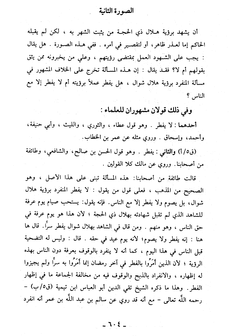 قالت طائفة من أصحابنا: هذه المسألة تبنى عَلَى هذا الأصل، وهو الصحيح من المذهب، فعلى قول من يقول: لا يفطر المنفرد برؤية هلال شوال، بل يصوم ولا يفطر إلا مع الناس. فإنه يقول: يستحب صيام يوم عرفة للشاهد الَّذِي لم تقبل شهادته بهلال ذي الحجة؛ لأنّ هذا هو يوم عرفة في حق الناس، وهو منهم. ومن قال في الشاهد بهلال شوال يفطر سرًّا. قال ها هنا: إنه يفطر ولا يصوم؛ لأنّه يوم عيد في حقه. قال: وليس له التضحية قبل الناس في هذا اليوم، كما أنه لا ينفرد بالوقوف بعرفة دون الناس بهذه الرؤية؛ لأنّ الذين أمَرُوا بالفطر في آخر رمضان إِنَّمَا أمَرُوا به سرًّا ولم يجيزوا له إظهاره، والانفراد بالذبح والوقوف فيه من مخالفة الجماعة ما في إظهار الفطر. وهذا ما ذكره الشيخ تقي الدين أبو العباس ابن تيمية -رحمه الله تعالى- مع أنه قد روي عن سالم بن عبد الله بن عمر أنه انفرد
