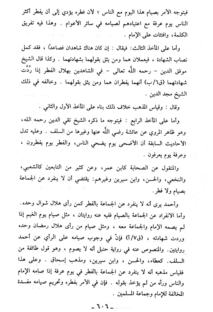 وأما عَلَى المأخذ الرابع: فيتوجه ما ذكره الشيخ تقي الدين رحمه الله، وهو ظاهر المروي عن عائشة رضي الله عنها وغيرها من السَّلف. وعليه تدل الأحاديث السابقة أن الأضحى يوم يضحي الناس، والفطر يوم يفطرون، وعرفة يوم يعرفون.