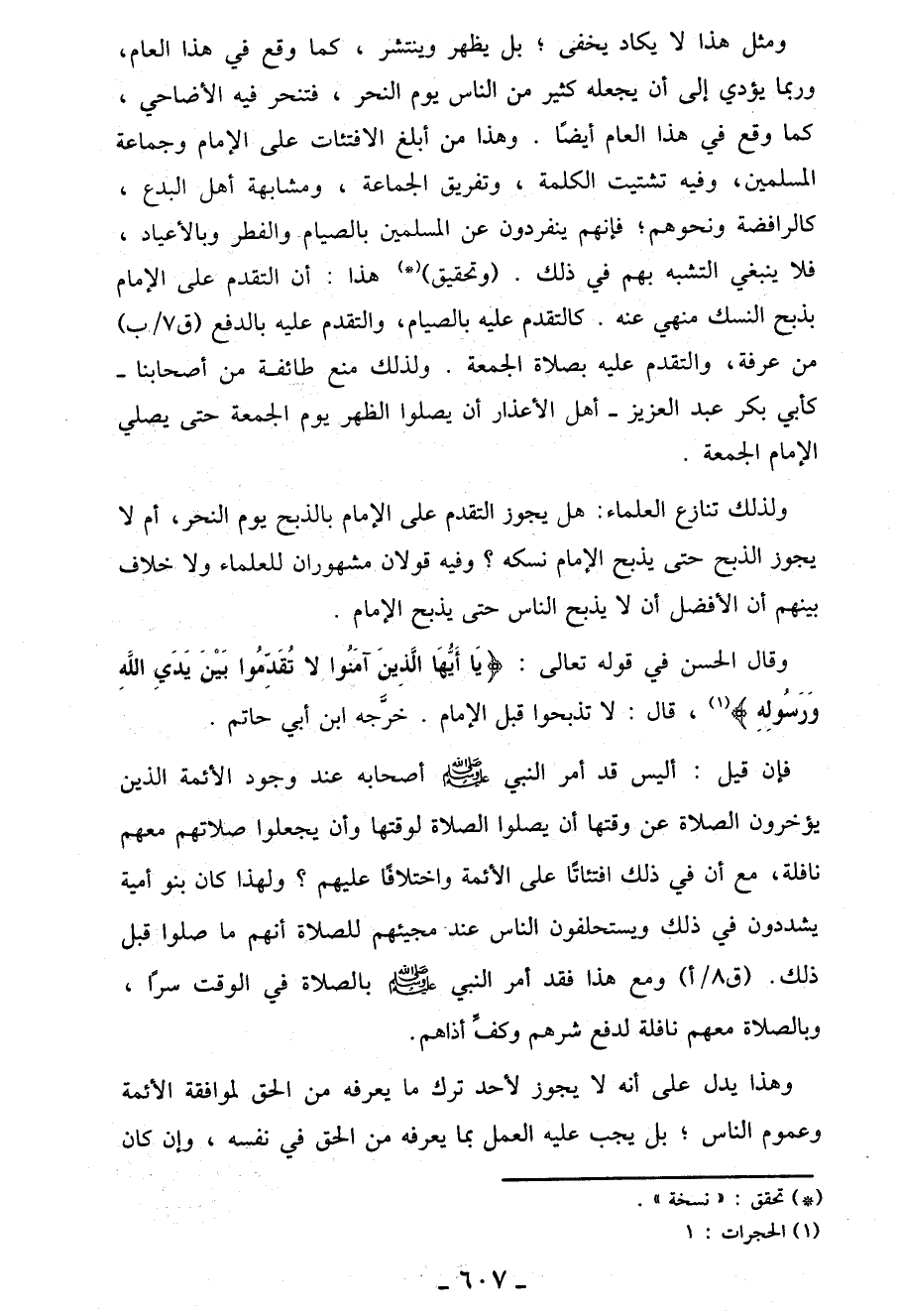 ومثل هذا لا يكاد يخفى؛ بل يظهر وينتشر، كما وقع في هذا العام، وربما يؤدي إِلَى أن يجعله كثير من الناس يوم النحر، فتنحر فيه الأضاحي، كما وقع في هذا العام أيضاً. وهذا من أبلغ الافتئات عَلَى الإمام وجماعة المسلمين، وفيه تشتيت الكلمة، وتفريق الجماعة، ومشابهة أهل البدع، كالرافضة ونحوهم؛ فإنهم ينفردون عن المسلمين بالصيام والفطر وبالأعياد، فلا ينبغي التشبه بهم في ذلك. (وتحقيق) (*) هذا: أن التقدم عَلَى الإمام بذبح النسك منهي عنه. كالتقدم عليه بالصيام، والتقدم عليه بالدفع من عرفة، والتقدم عليه بصلاة الجمعة. ولذلك منع طائفة من أصحابنا - كأبي بكر عبد العزيز- أهل الأعذار أن يصلوا الظهر يوم الجمعة حتى يصلي الإمام الجمعة.
