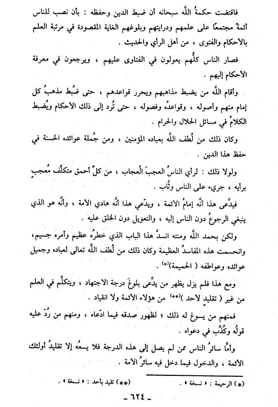 فاقتضت حكمةُ الله سبحانه أن ضبط الدين وحفظه: بأن نصب للناس أئمة مجتمعًا عَلَى علمهم ودرايتهم وبلوغهم الغاية المقصودة في مرتبة العِلْم بالأحكام والفتوى، من أهل الرأي والحديث.