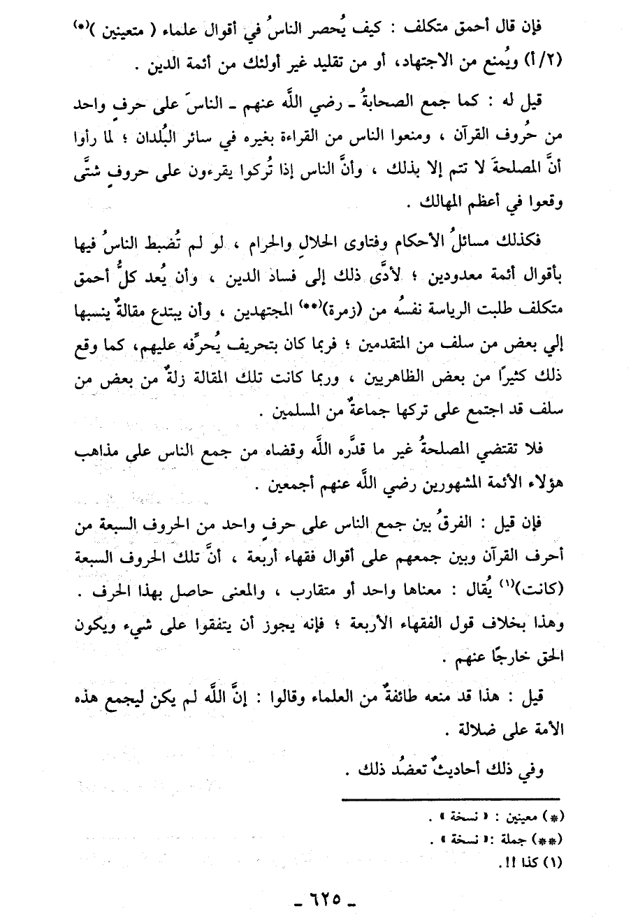 فكذلك مسائلُ الأحكام وفتاوى الحلالِ والحرام، لو لم تُضبط الناسُ فيها بأقوال أئمة معدودين؛ لأدَّى ذلك إِلَى فساد الدين، وأن يُعد كلُّ أحمق متكلف طلبت الرياسة نفسُه من (زمرة) (**) المجتهدين، وأن يبتدع مقالةٌ ينسبها إلي بعض من سلف من المتقدمين؛ فربما كان بتحريف يُحرِّفه عليهم، كما وقع ذلك كثيرًا من بعض الظاهريين، وربما كانت تلك المقالة زلةٌ من بعض من سلف قد اجتمع عَلَى تركها جماعةٌ من المسلمين.