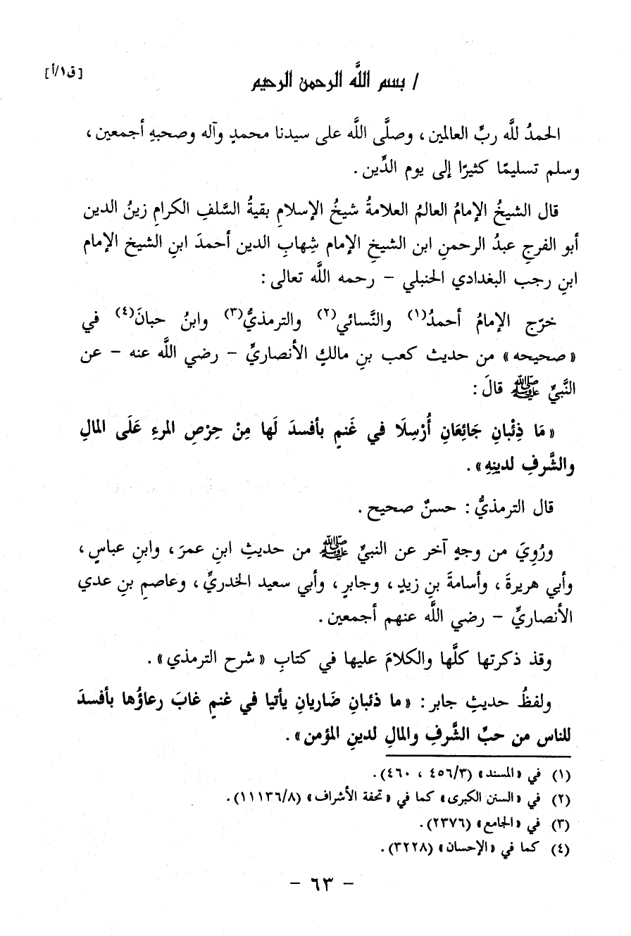قال الشيخُ الإمامُ العالمُ العلامةُ شيخُ الإسلامِ بقيةُ السَّلفِ الكرامِ زينٌ الدين أبو الفرج عبدُ الرحمن ابن الشيخ الإمام شِهابِ الدين أحمدَ ابنِ الشيخ الإمام ابنِ رجب البغدادي الحنبلي -رحمه الله تعالى: