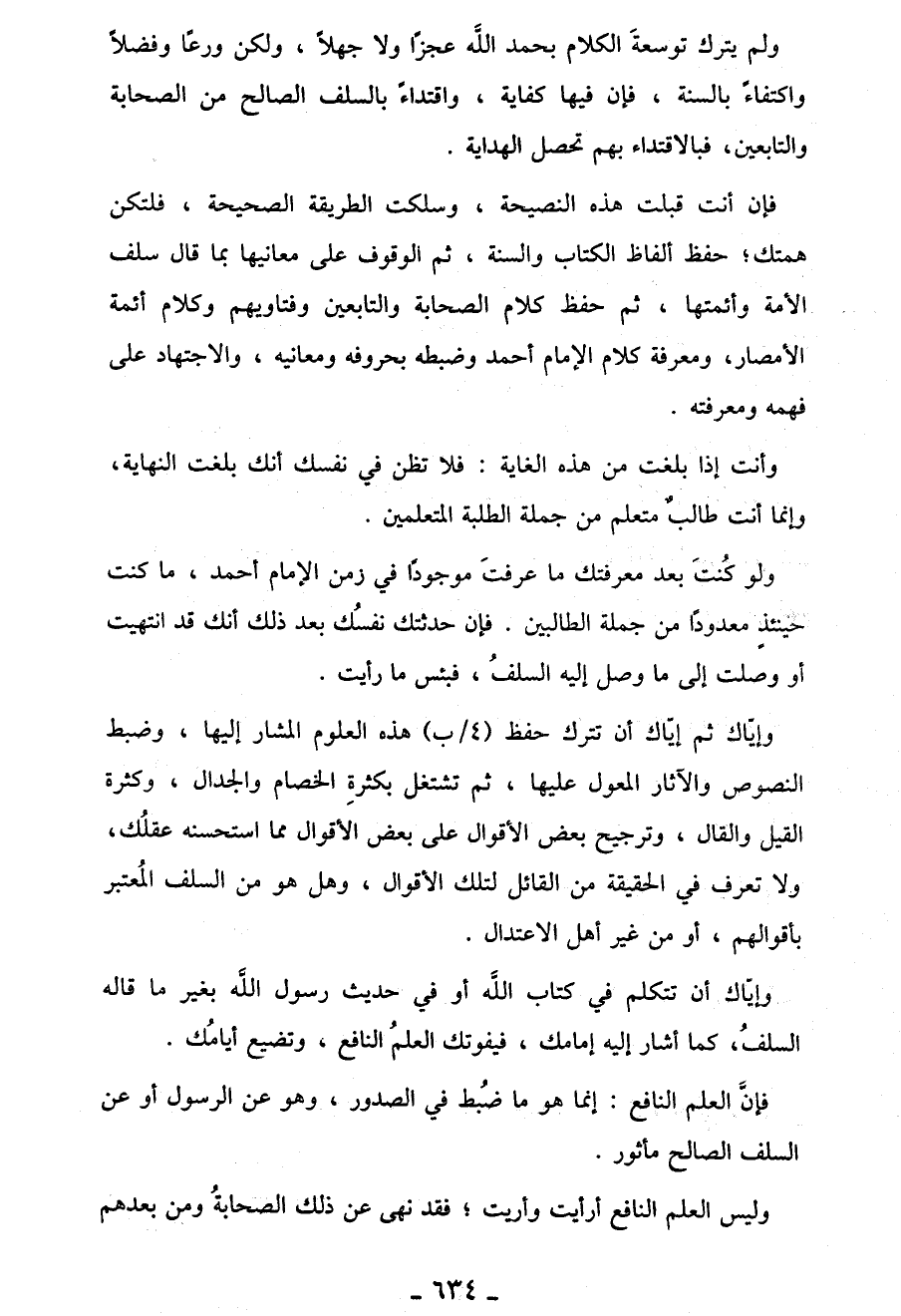 وإيّاك ثم إيّاك أن تترك حفظ هذه العلوم المشار إليها، وضبط النصوص والآثار المعول عليها، ثم تشتغل بكثرةِ الخصام والجدال، وكثرة القيل والقال، وترجيح بعض الأقوال عَلَى بعض الأقوال مما استحسنه عقلُك، لا تعرف في الحقيقة من القائل لتلك الأقوال، وهل هو من السَّلف المُعتبر بأقوالهم، أو من غير أهل الاعتدال.
