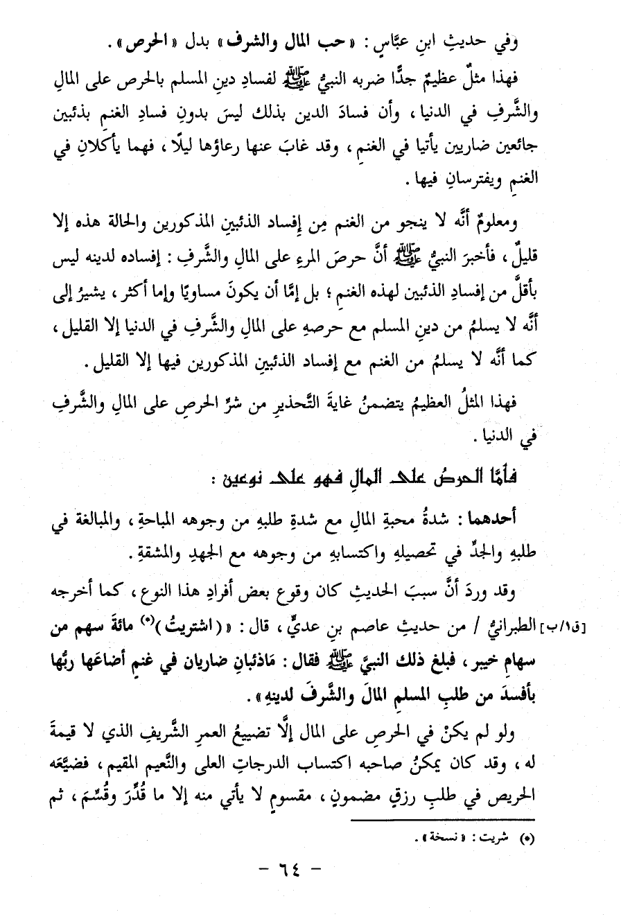 وفي حديث ابن عبَّاسٍ: "حُبِّ المَالِ وَالشَّرَفِ" بدل "الحرص".