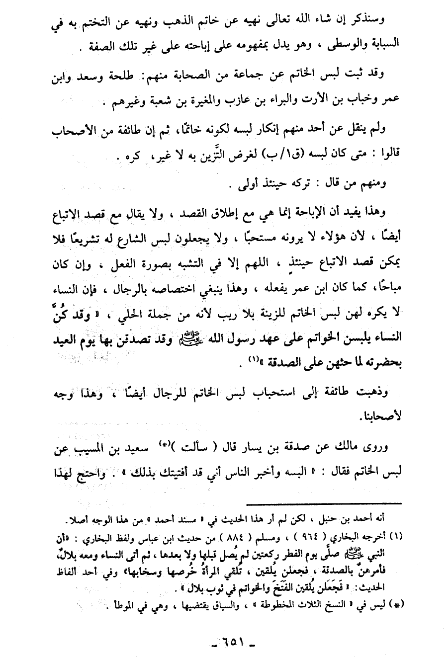 وهذا يفيد أن الإباحة إِنَّمَا هي مع إطلاق القصد، ولا يقال مع قصد الاتباع أيضًا، لأن هؤلاء لا يرونه مستحبًّا، ولا يجعلون لبس الشارع له تشريعًا فلا يمكن قصد الاتباع حينئذٍ، اللهم إلا في التشبه بصورة الفعل، وإن كان مباحًا، كما كان ابن عمر يفعله، وهذا ينبغي اختصاصه بالرجال، فإن النساء لا يكره لهن لبس الخاتم للزينة بلا ريب لأنّه من جملة الحلي، "وقد كُنَّ النساء يلبسن الخواتم عَلَى عهد رسول الله - صلى الله عليه وسلم - وقد تصدقن بها يوم العيد بحضرته لما حثهن عَلَى الصدقة" (¬1).