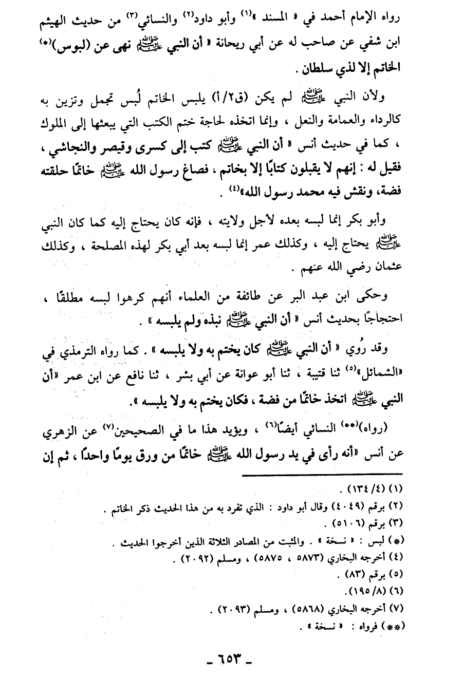 ولأن النبي صلى الله عليه وسلم لم يكن يلبس الخاتم لُبس تجمل وتزين به كالرداء والعمامة والنعل، وإنَّما اتخذه لحاجة ختم الكتب التي يبعثها إِلَى الملوك، كما في حديث أنس «أَنَّ النَّبِيَّ صَلَّى اللهُ عَلَيْهِ وَسَلَّمَ كَتَبَ إِلَى كِسْرَى وَقَيْصَرَ وَالنَّجَاشِيِّ، فَقِيلَ لَهُ: إِنَّهُمْ لاَ يَقْبَلُونَ كِتَابًا إِلَّا بِخَاتَمٌ: فَصَاغَ رَسُولُ اللهِ صَلَّى اللهُ عَلَيْهِ وَسَلَّمَ خَاتَمًا حَلْقَتُهُ فِضَّةً، وَنَقَشَ فِيهِ مُحَمَّدٌ رَسُولُ اللهِ» (¬4).