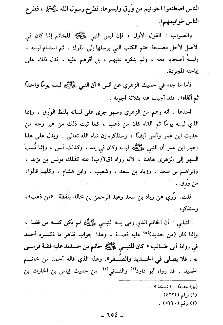 والصواب: القول الأول، فإن لبس النبي صلى الله عليه وسلم للخاتم إِنَّمَا كان في الأصل لأجل مصلحة ختم الكتب التي يرسلها إِلَى الملوك، ثم استدام لبسه، ولبسهُ أصحابه معه، ولم ينكره عليهم، بل أقرهم عليه، فدل ذلك عَلَى إباحته المجردة.