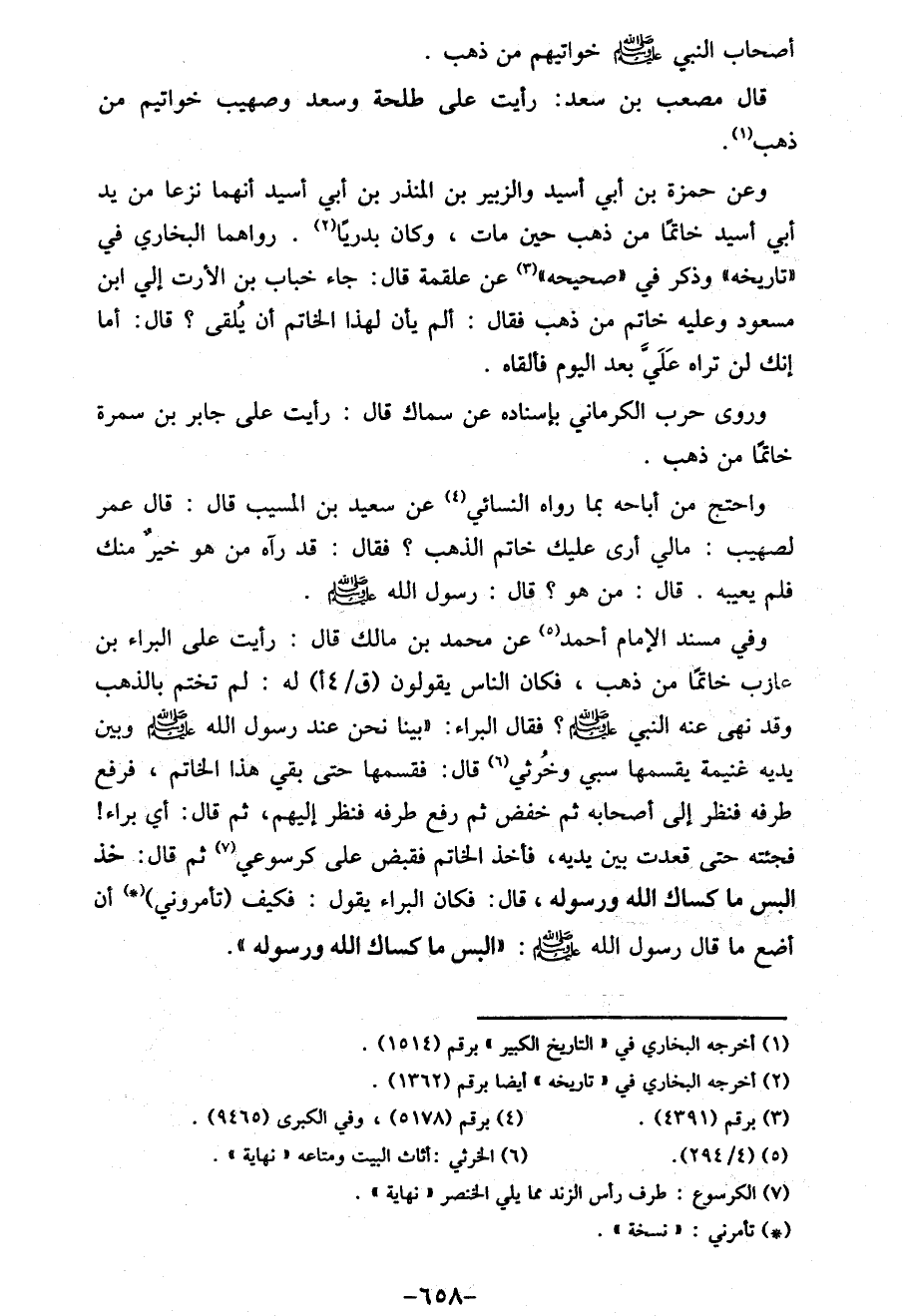قال مصعب بن سعد: رأيت عَلَى طلحة وسعد وصهيب خواتيم من ذهب (¬1).