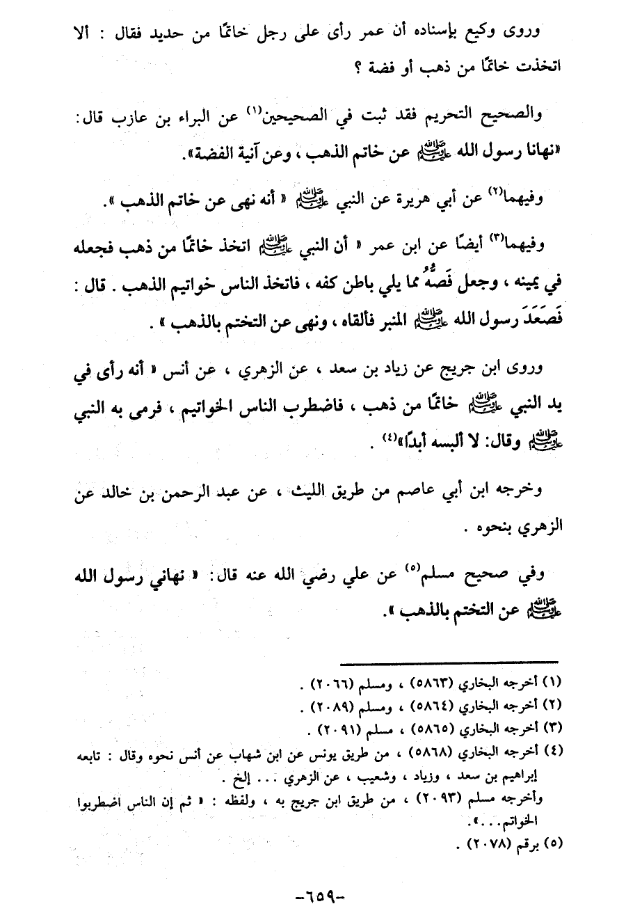 وروى ابن جريج عن زياد بن سعد، عن الزهري، عن أنس "أنَّه رأى في يد النبي صلى الله عليه وسلم خاتمًا من ذهب، فاضطرب الناس الخواتيم، فرمى به النبي وقال: لا ألبسه أبدًا" (¬4).