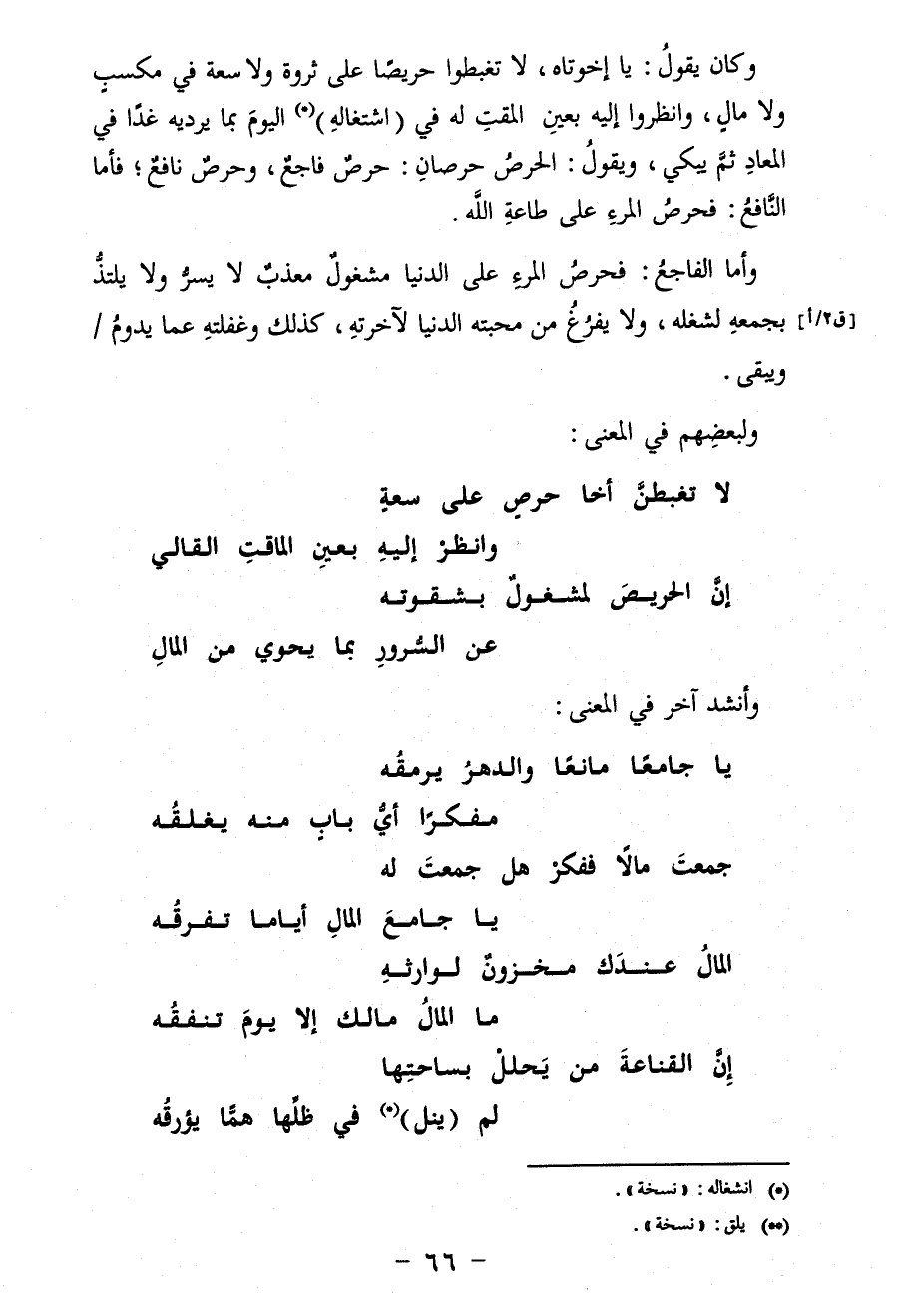 وكان يقولُ: يا إخوتاه، لا تغبطوا حريصًا عَلَى ثروة ولا سعة في مكسبٍ ولا مالٍ، وانظروا إِلَيْهِ بعين المقتِ له في (اشتغالِه) (*) اليومَ بما ورديه غدًا في المعاد ثُمَّ ييكي، ويقولُ: الحرصُ حرصانِ: حرصٌ فاجعٌ، وحرصٌ نافعٌ؟ فأما النَّافعُ: فحرصُ المرءِ عَلَى طاعةِ اللهِ.