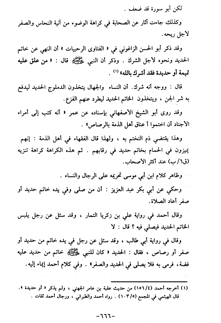 وقد ذكر أبو الحسن الزاغوني في "الفتاوى الرحبيات" أن النهي عن خاتم الحديد ونحوه لأجل الشرك. وذكر أن النبي صلى الله عليه وسلم قال: "من علق عليه تميمة أو حديدة فقد أشرك بالله" (¬1).