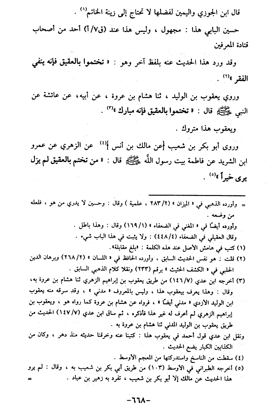 وروي يعقوب بن الوليد، ثنا هشام بن عروة، عن أبيه، عن عائشة عن النبي - صلى الله عليه وسلم - قال: "تختموا بالعقيق فإنَّه مبارك" (¬3).
