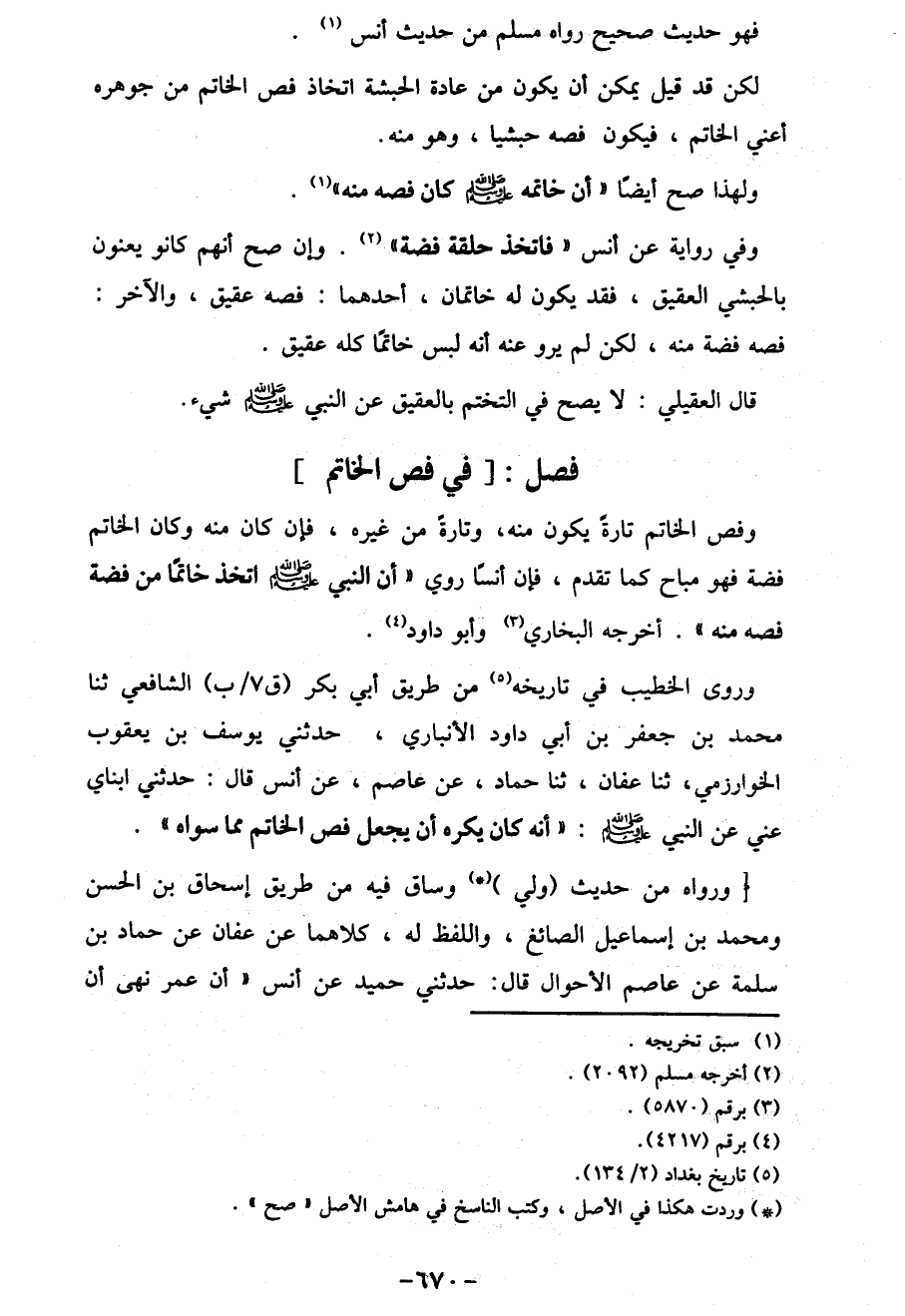 وروى الخطيب في تاريخه (¬5) من طريق أبي بكر الشافعي ثنا محمد بن جعفر بن أبي داود الأنباري، حدثني يوسف بن يعقوب الخوارزمي، ثنا عفان، ثنا حماد، عن عاصم، عن أنس قال: حدثني ابناي عني عن النبي - صلى الله عليه وسلم -: "أنَّه كان يكره أن يجعل فص الخاتم مما سواه".