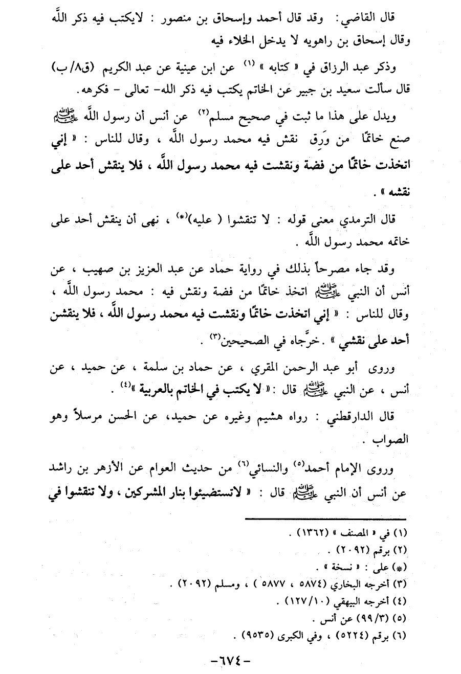 وروى أبو عبد الرحمن المقري، عن حماد بن سلمة، عن حميد، عن أنس، عن النبي صلى الله عليه وسلم قال: "لا يكتب في الخاتم بالعربية" (¬4).