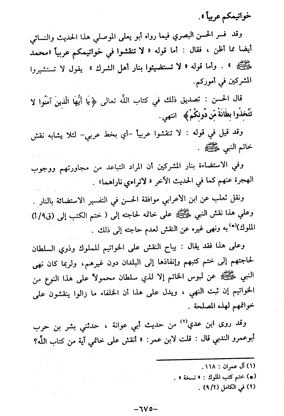 وقد قيل في قوله: لا تنقشوا عربيًا -أي بخط عربي- لئلا يشابه نقش خاتم النبي صلى الله عليه وسلم.